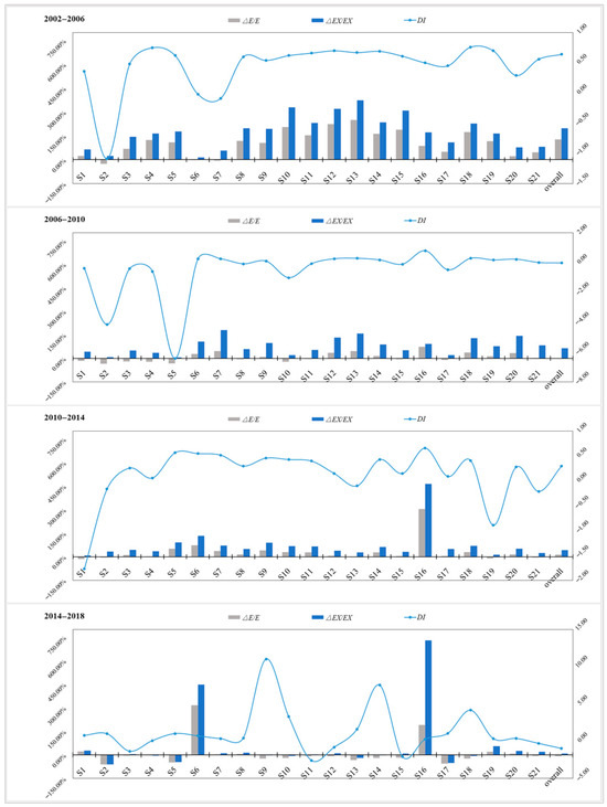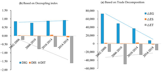 where DI represents the period of China’s export growth and energy consumption DI, and represents China’s export trade–energy consumption in the base period and the reporting period, respectively, and denote China’s total exports in the base period and the reporting period, respectively, and and refer to the amount of change in export trade–energy consumption and the amount of change in export size, respectively.