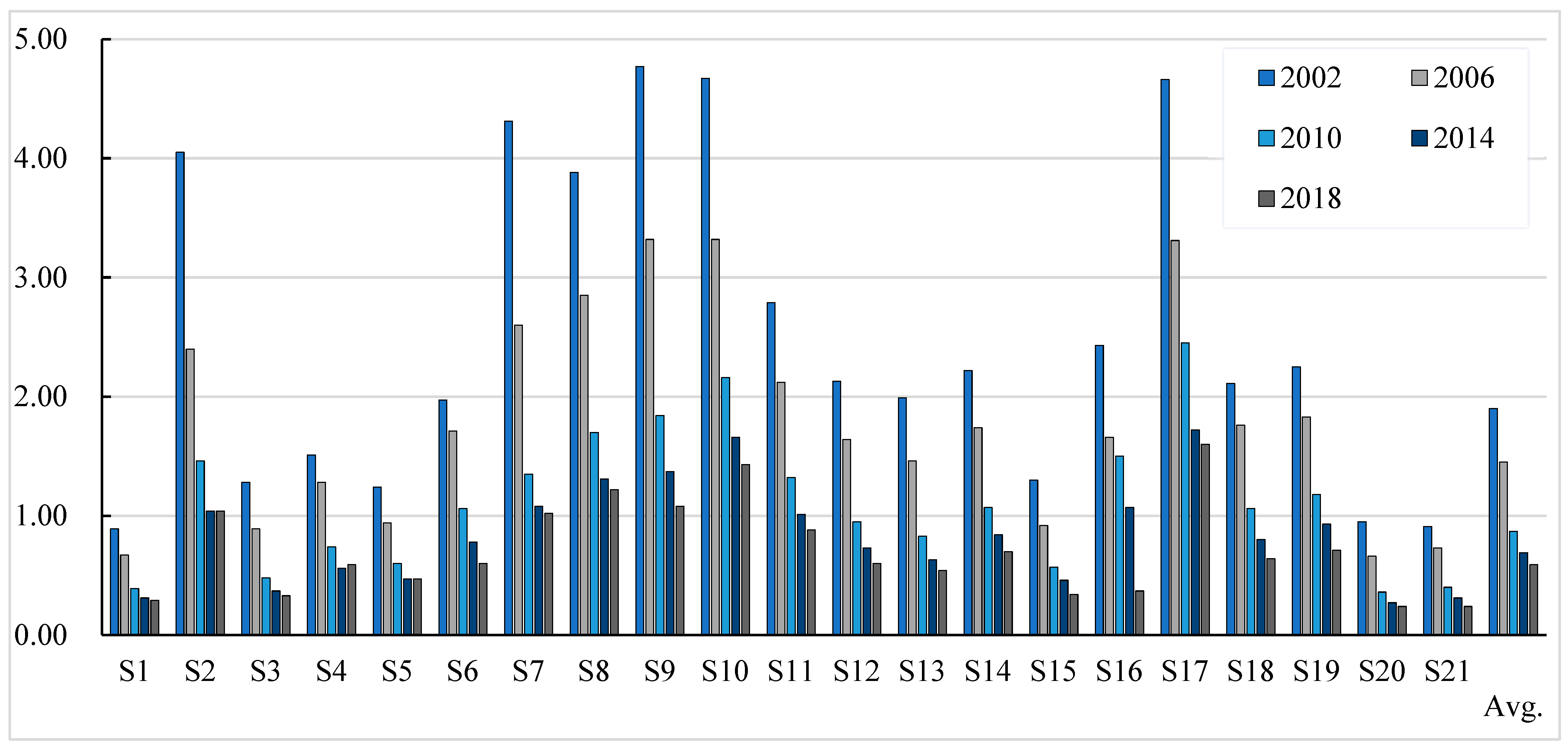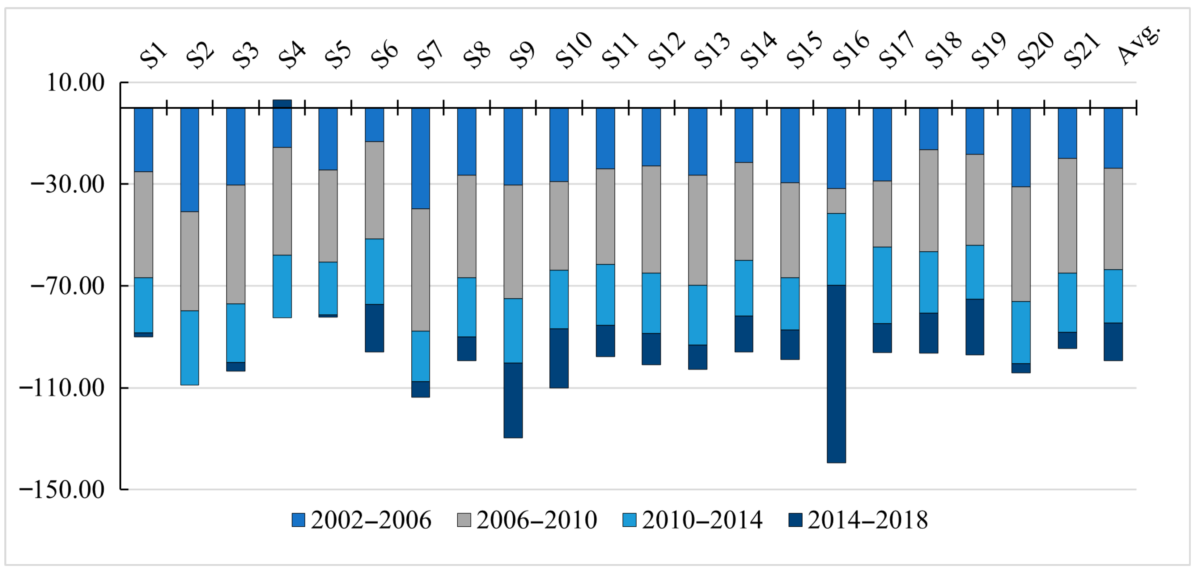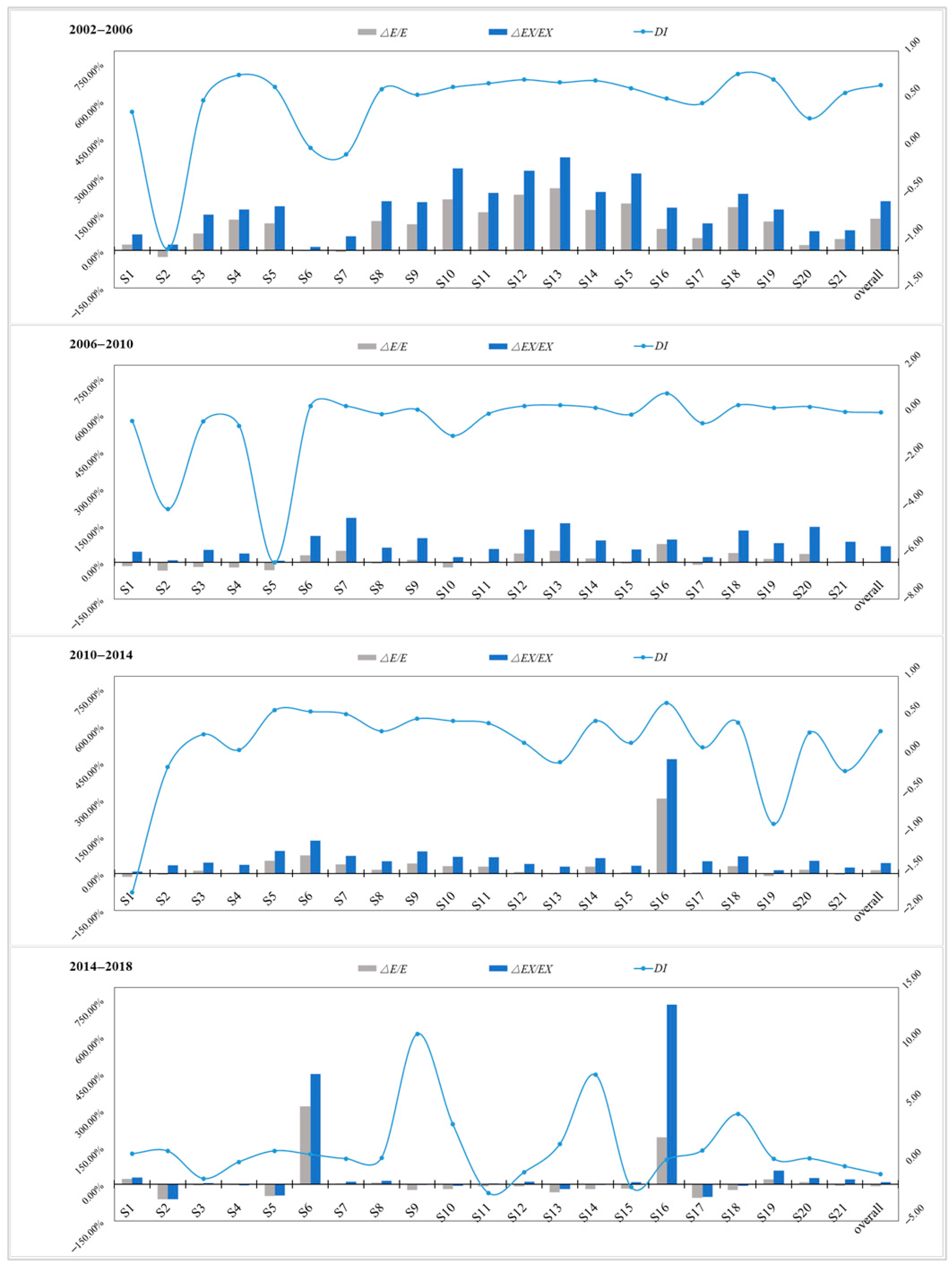 4.1.1. China’s Export Trade–Energy Consumption Intensity and Its Changes