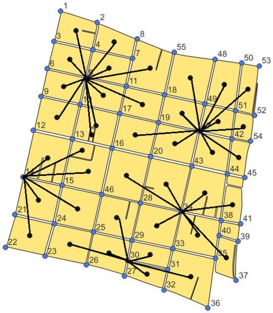 For illustrative purposes, Figure 1 presents a graphical representation of a feasible solution to the proposed problem for a small, arbitrary instance involving bin allocation at road intersections (blue dots or set J). The black dots represent the centroids of the waste generation points (set I). In the example, collection sites are activated, and the waste generation points are assigned to their nearest site. For simplicity, the details regarding the number of assigned bins and their capacities and the quantity of waste stored in these bins for different waste types are omitted.