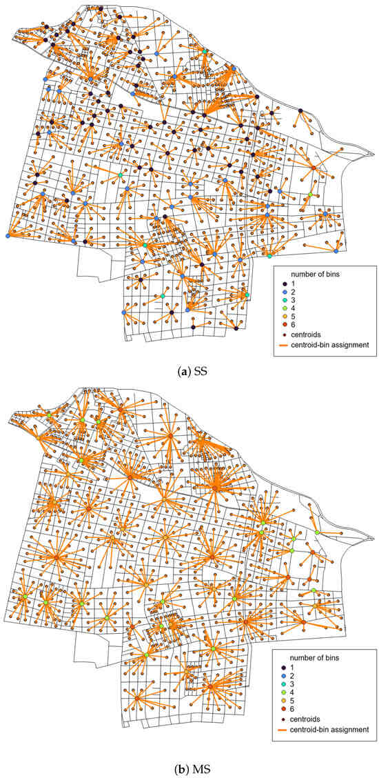 Figure 4 and Figure 5 depict the results of the bin location–allocation at road intersections and in public spaces for the base case scenario, respectively. For comparison purposes, both figures present the results with [m]. These figures reveal that MS requires an inferior number of sites to receive the disposed recyclable waste than SS. However, a larger number of bins are needed at each site to accommodate the separated waste by recyclable type for MS. For example, Figure 4a indicates that most selected sites at road intersections require one or two bins for SS, whereas Figure 4b shows that most sites need between four and six bins for MS. Similar results are depicted in Figure 5, in which one, two, and three bins are used at each public space for SS (Figure 5a), and most of the selected sites require the maximum number of six bins for MS (Figure 5b).