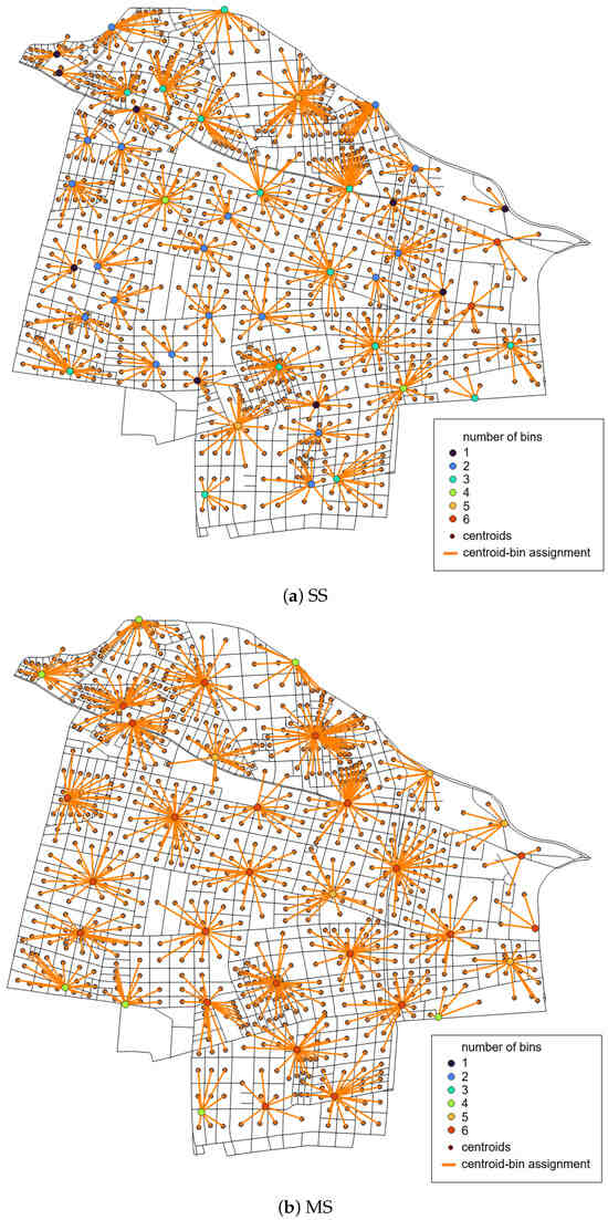 Table 3 shows the results with both SS and MS for the base case scenario and the sensitivity analysis using collection sites in public spaces. Results for cases with [m] and [m] are infeasible, and thus, they were excluded from the table. In these cases, 100% coverage is not fulfilled since at least one centroid has no collection site allocated within the defined threshold distance . Similarly to the results reported in Table 2 with road intersections, this table indicates that SS is more economical than MS since an inferior number of bins is required with mixed recyclable waste, and additionally, lower average distances from centroids to public spaces are observed for SS. Table 3 also shows that the average bin utilization for MS is less than for SS. Notice that this utilization increases significantly, reaching near 100% for collection sites in public spaces. Thus, the scenario for MS strategy and with [m] becomes infeasible when the waste generation increases by 20% relative to the base case scenario.