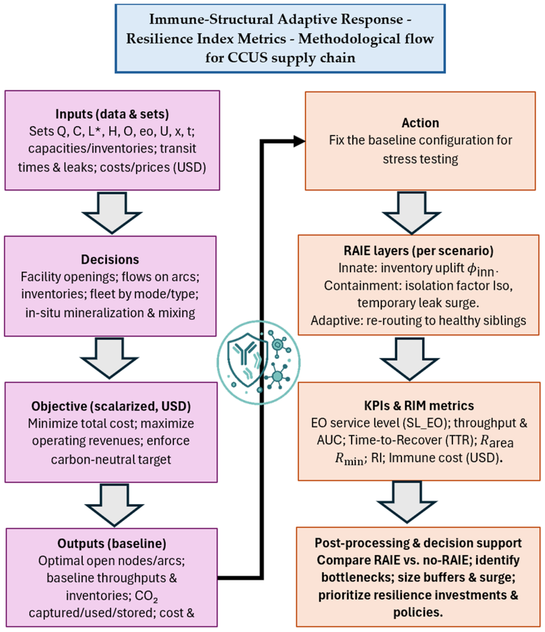 The proposed framework unfolds in two complementary phases. Phase I (baseline design and operation): the multi-period design–operation problem is solved, determining which facilities and corridors are activated and how flows are scheduled on a quarterly basis. The outcome is a feasible configuration that maximizes net economic performance subject to mass balances, capacity limits, injectivity, mode-specific losses, and inventory constraints. This phase provides baseline series (e.g., throughput and capture per period) along with associated costs and revenues, which serve as quantitative references. Phase II (viability and resilience with RAIE): building on the frozen baseline design, disruption scenarios are introduced, parameterized by temporal window, severity, and location. In each ω, RAIE modulates the system’s response through three mechanisms: (i) innate, local elevation of minimum inventories during the shock; (ii) adaptive, surge capacity in healthy nodes to absorb deviations; and (iii) memory, transient post-shock reinforcement that accelerates recovery. For causal quantification, each scenario is executed under two conditions: RAIE–ON (with innate, adaptive, and memory mechanisms activated) and the counterfactual non-SIH condition (RAIE–OFF), maintaining identical severity and shock window. This symmetry allows isolating the contribution of RAIE to performance. Figure 1 illustrates the flow diagram of the proposed methodology.