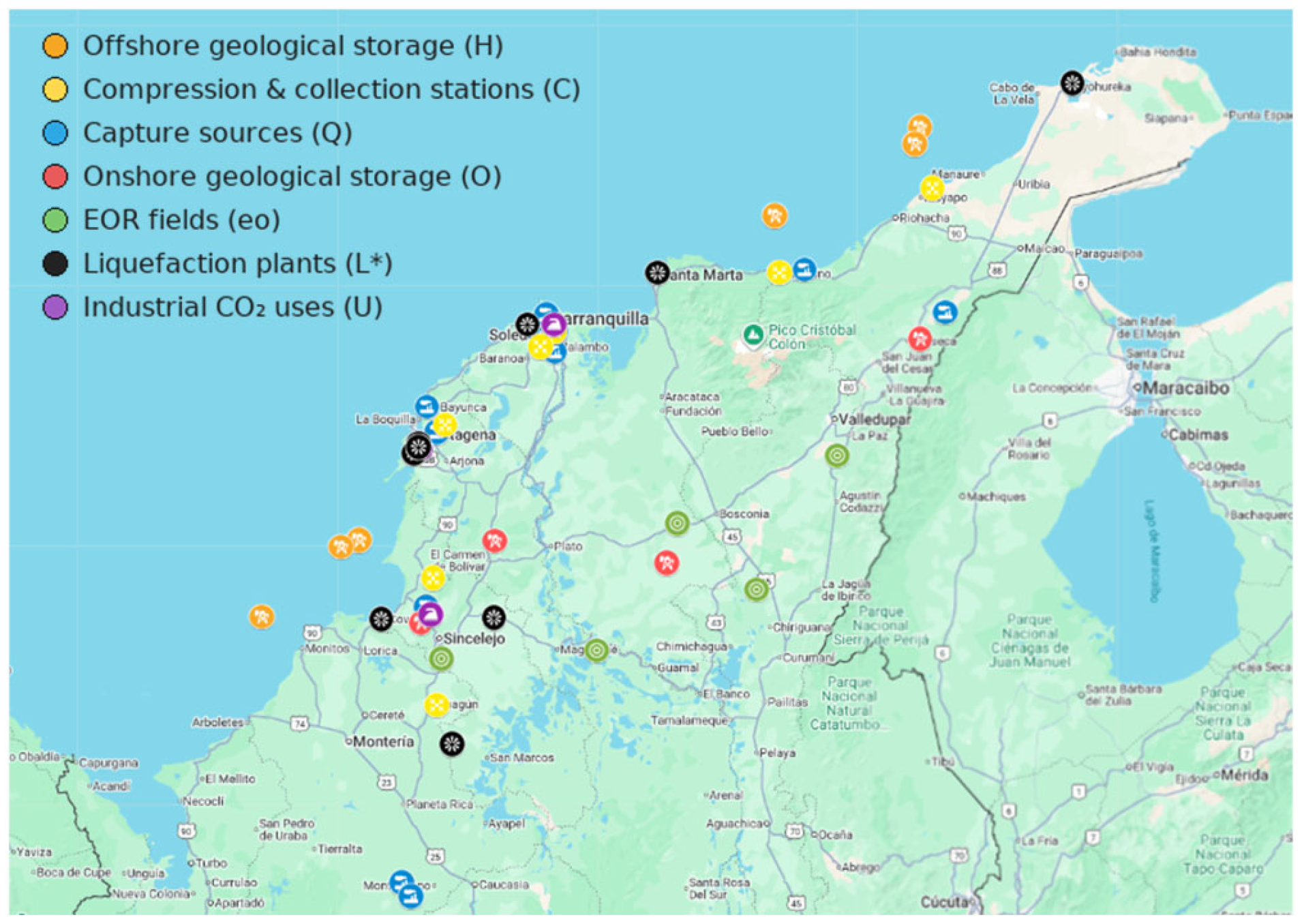 At the regional level, research in Latin America—and particularly in Colombia—is gaining momentum within national decarbonization frameworks. Studies employing the Global Change Analysis Model (GCAM) indicate that achieving mid-century carbon neutrality requires maintaining natural gas and bioenergy systems coupled with CCUS to ensure energy security under stringent emission targets [24,25]. Geological assessments have identified significant storage potential in offshore basins such as Guajira and Sinú, and in onshore formations like Cesar–Ranchería and Middle Magdalena, positioning Colombia as one of the few South American countries with viable CO2 storage capacity [105]. These formations, together with the concentration of industrial sources along the Caribbean coast, make offshore shipping-based logistics an efficient configuration for transporting captured CO2 to saline aquifers or depleted hydrocarbon reservoirs [106,107]. Comparative analyses further suggest that maritime transport becomes cost-competitive with pipelines beyond approximately 400 km and for annual CO2 flows of 2–3 Mt, a condition consistent with Colombia’s emission clusters and regional industrial hubs [25].