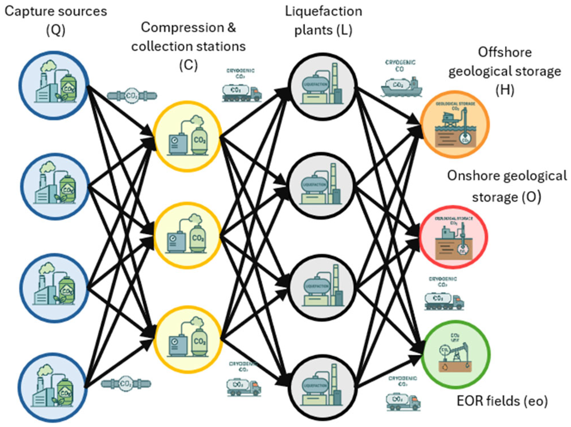 The CCUS network can be conceptualized as a multi-echelon system comprising interdependent upstream, midstream, and downstream layers. The upstream segment includes industrial emitters such as cement, steel, and power plants, which act as CO2 sources feeding the capture subsystem. The midstream layer encompasses compression and liquefaction facilities—often managed by energy operators or service providers—responsible for conditioning CO2 for multimodal transport via pipelines, cryogenic trucks, or ships. The downstream layer integrates storage and utilization pathways: offshore and onshore geological reservoirs managed by energy agencies, enhanced-oil-recovery (EOR) fields operated by petroleum companies, and industrial users that convert CO2 into chemicals or construction materials. Cross-cutting stakeholders such as regulators, port authorities, and digital-monitoring providers ensure traceability, safety, and carbon-neutral compliance across the chain. This layered configuration establishes the physical and institutional backbone on which the RAIE-based MILP model operates, allowing the analysis of both logistical and adaptive dynamics in an integrated manner.