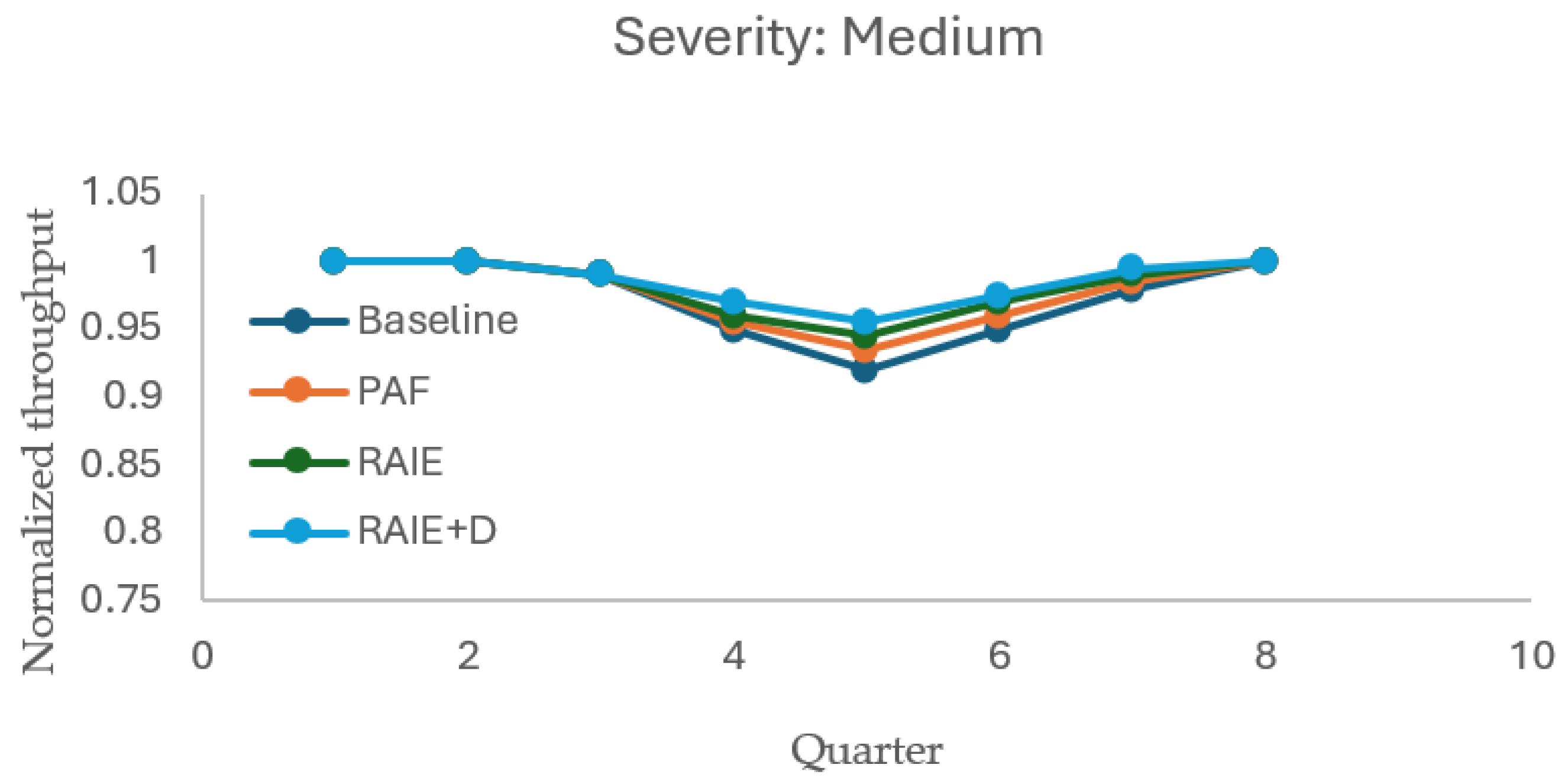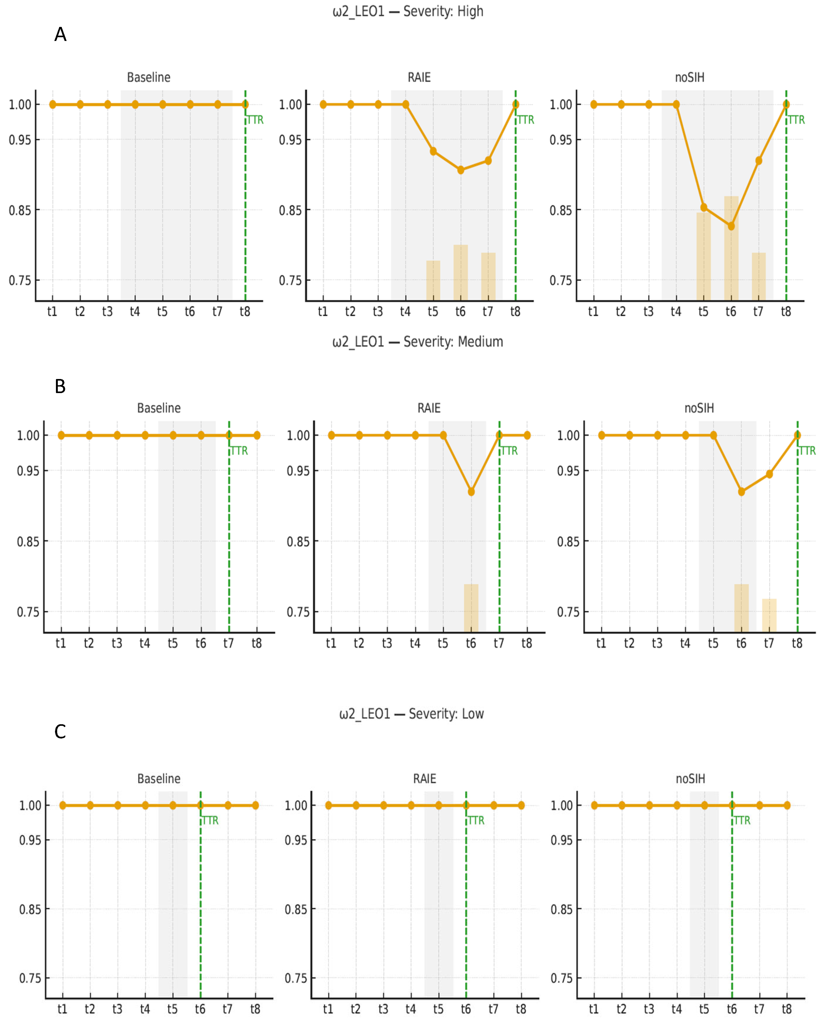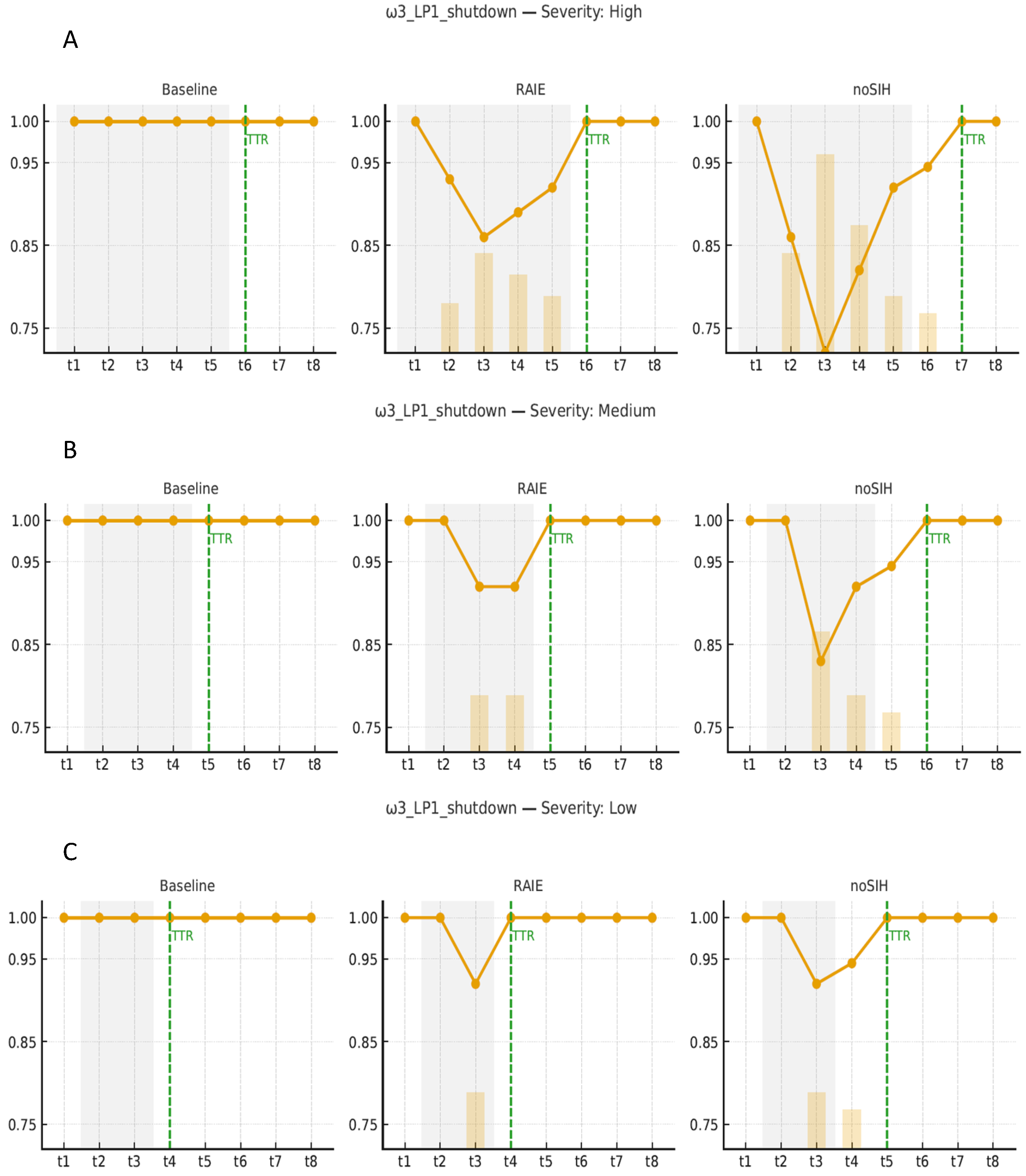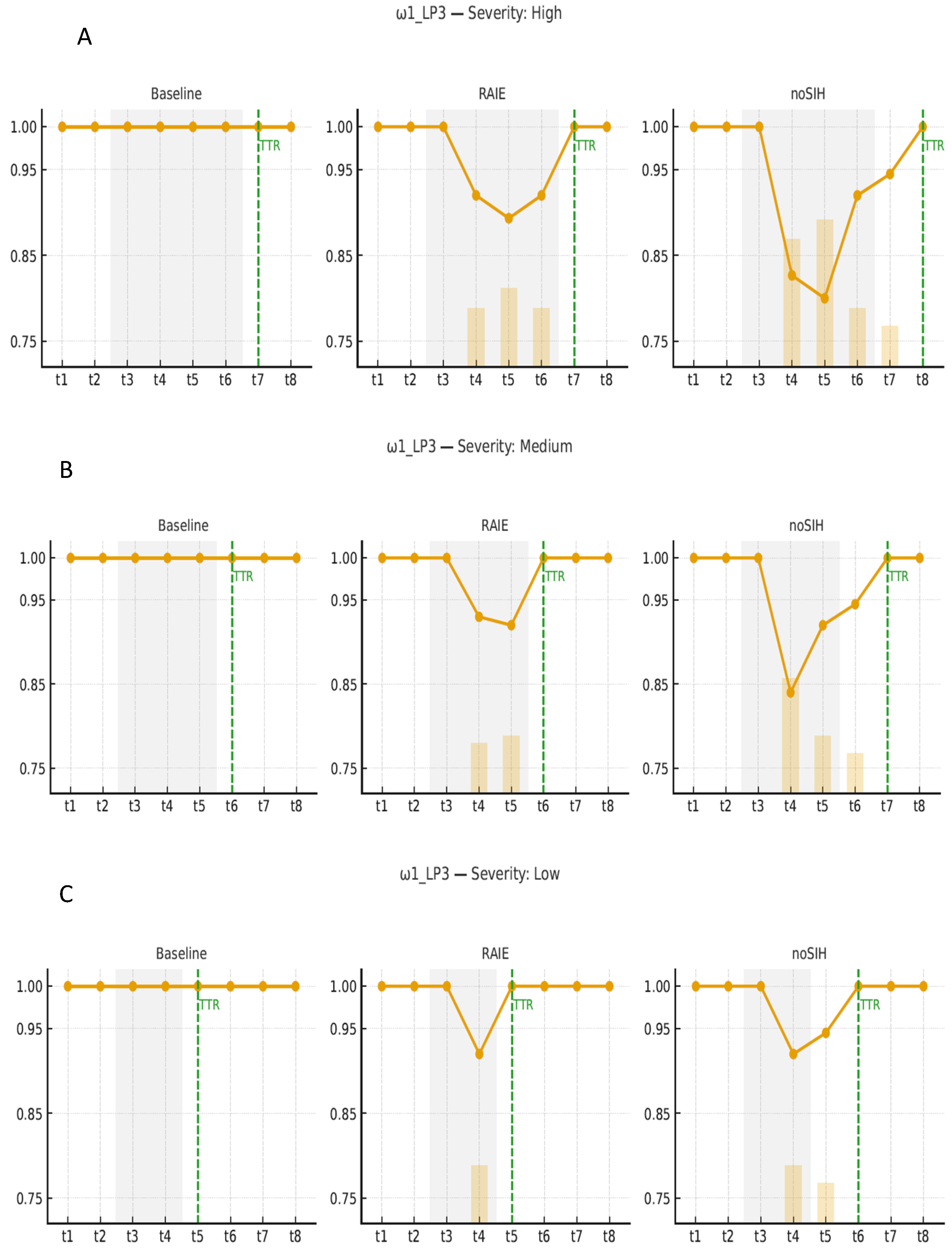 The design of RAIE is inspired by the human immune system (SIH) and its response to pathogens. The innate component is fast, local, and non-specific (analogous to minimum inventories and operational safeguards that stabilize the affected node during a crisis). The adaptive component coordinates a systemic response that redistributes functions to healthy organs (surge capacity and alternate routing to sustain throughput during the disruption). Finally, immune memory reduces convalescence time upon repeated exposures (recovery mechanisms that shorten the TTR once the shock ends). From an operational perspective, this analogy is implemented through scenario parameters acting on effective capacities, minimum inventory, and temporary losses, without altering the underlying optimization model structure. The analysis systematically compares ω across three severity levels (high, medium, low) and under two regimes (RAIE–ON vs. non-SIH), reporting both absolute and relative differences. Anchored in the immune metaphor, this reading enables attribution of RAIE’s benefits—backlog reduction, service-level enhancement, and TTR shortening—while also prioritizing critical corridors and nodes in the design. The results thus provide practical guidelines for reinforcing the CCUS network against plausible disruptions.
