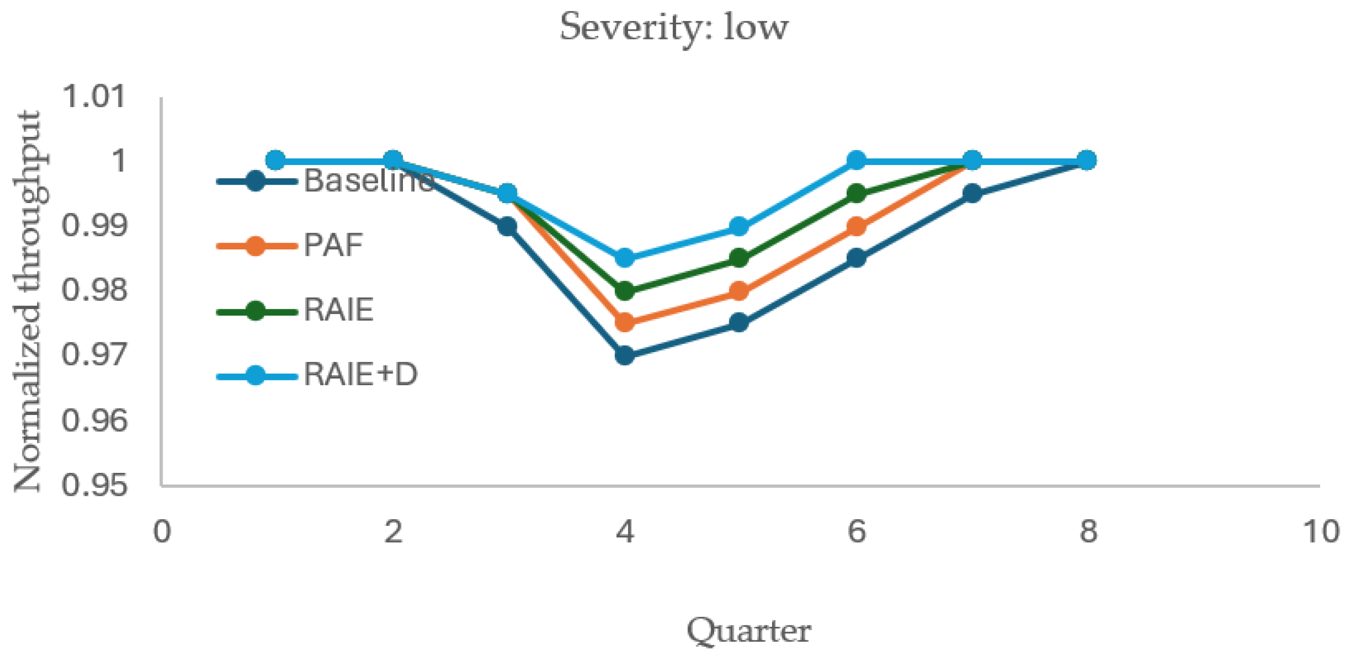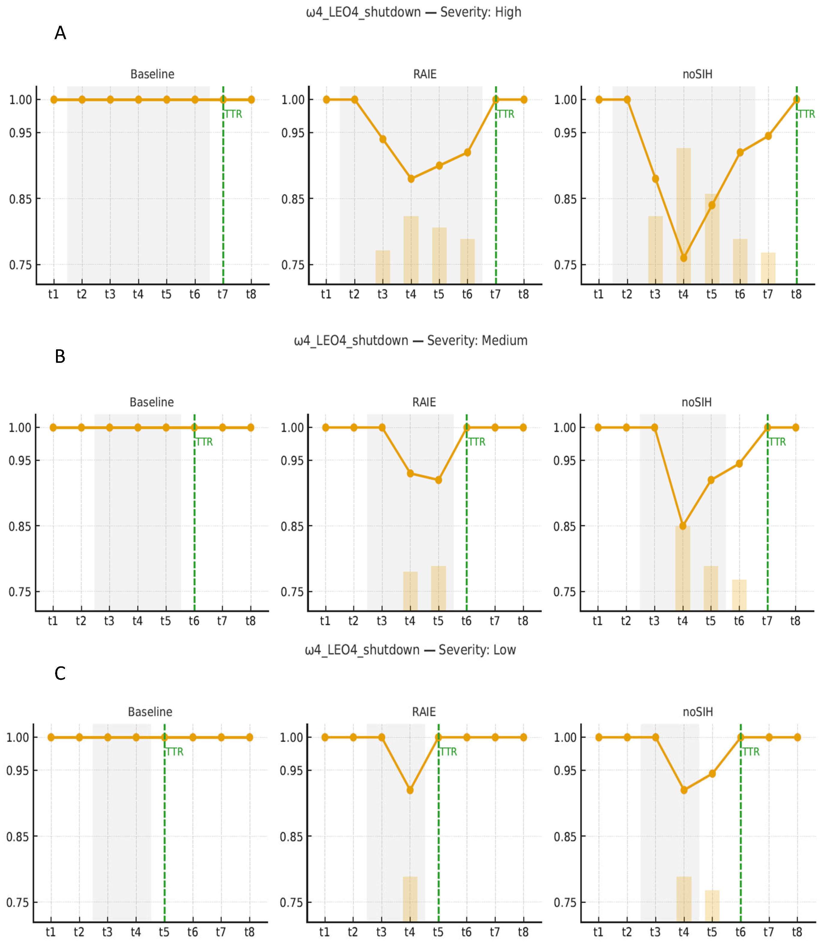 To objectively evaluate performance under disruptions, we employ a set of RIM (Resilience Impact Metrics) designed to quantify the viability and resilience of the CCUS chain in each scenario ω and period t. The central idea is to compare, for key operating curves (e.g., total throughput and EO service), the scenario trajectory with its disruption-free baseline and to summarize the impact using normalized, interpretable indicators. Specifically, we use: (i) a viability flag ΩOK(ω) indicating whether the model satisfies all constraints; (ii) service-level metrics (e.g., EO service) and the area under the capture/throughput curve over the horizon; and three strict resilience metrics: (integrated performance loss during and after the shock), (maximum relative pointwise drop), and TTR (time-to-recover), i.e., the first post-shock period in which the deviation falls below a technical tolerance. All metrics are constructed from the baseline curve ybase(t) and the scenario curve (e.g., total throughput), such that ∈ [0, 1] and ∈ [0, 1] higher values imply greater resilience, while TTR is expressed in quarters. The area metric captures the accumulated severity of the impact (depth × duration), the minimum metric captures the worst instantaneous drop, and TTR captures the speed of recovery; together they provide a complementary view of dynamic behavior. To maintain comparability across scenarios and severity levels, we normalize by the area and maxima of the baseline curve and use a fixed tolerance (e.g., 3–5%) to declare recovery. Finally, we report these metrics by functional module (LP and LEO) and for the entire system, thereby linking the RIM results to the RAIE layers (innate, adaptive, memory) and to the design’s economic–environmental trade-offs.