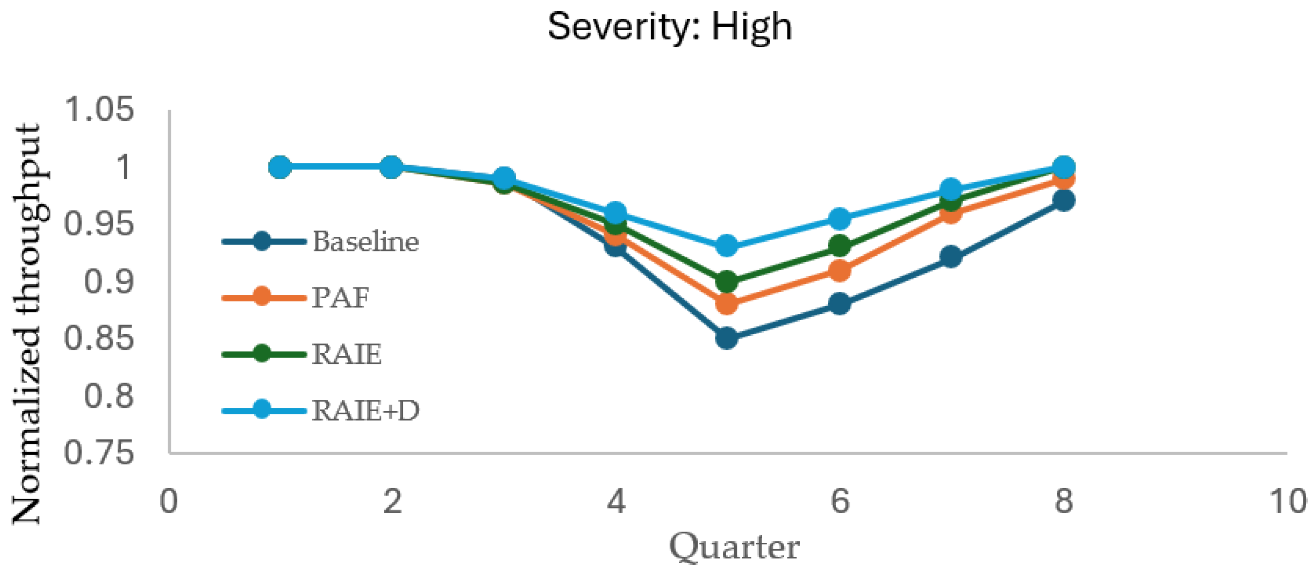 The design of RAIE is inspired by the human immune system and its response to pathogens. The innate component is fast, local, and non-specific (analogous to minimum inventories and operational safeguards that stabilize the affected node during a crisis). The adaptive component coordinates a systemic response that redistributes functions to healthy organs (surge capacity and alternate routing to sustain throughput during the disruption). Finally, immune memory reduces convalescence time upon repeated exposures (recovery mechanisms that shorten the TTR once the shock ends).