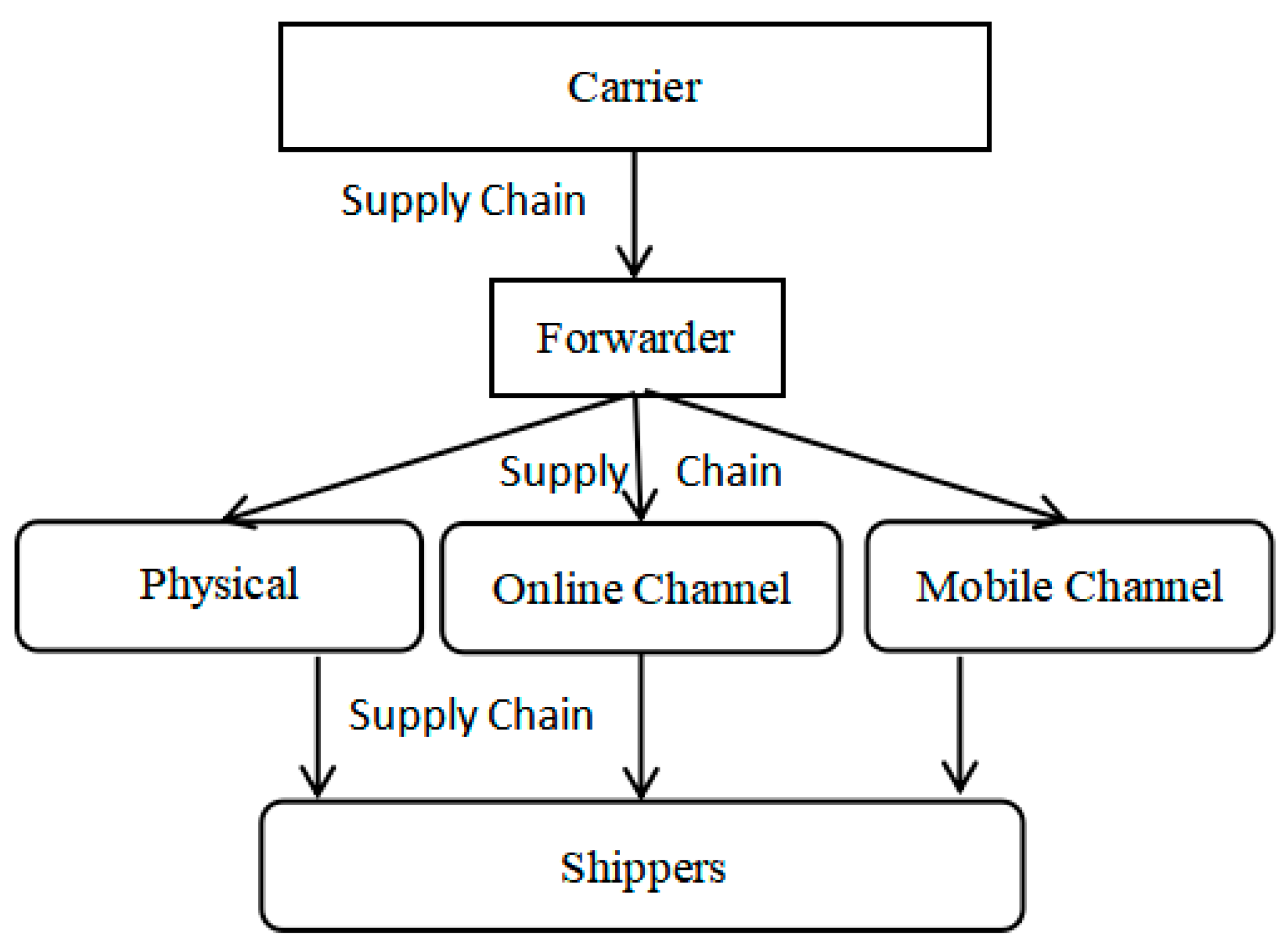 With the opening of online channels by various members in the shipping supply chain, the distance between carriers and forwarders has been shortened. Compared with the traditional offline physical service model, forwarders have lower time costs in searching for transportation services that meet their needs when booking, tracking, and managing shipping services through online channels and can quickly find services that meet their requirements. In addition to saving time costs online, online channels can also reduce the operating and operational costs of traditional ticketing or agency services for offline physical operations of forwarders. The consumption form on the mobile channel is similar to that on the network terminal to a certain extent, so the sales price of the marine service on the network channel and the sales price of the marine service on the mobile channel are lower than the marine service on offline physical channels for retail in general conditions and in the general service scope, so the consumption demand for marine service in the market will rise accordingly. However, the online channels described in this paper mainly refer to bookings that need to be completed through desktop computers in the office, while mobile channels include the use of apps [26] to log in to the carrier’s system for service booking, which can meet the needs of shippers to complete bookings anytime and anywhere using mobile phones by 5G networks or even satellite signals. This has higher requirements for the carrier’s data consistency and coordination capabilities. Based on the assumption that the service market demand share of the forwarders is expanding under the omni-channel model of the supply chain, this paper analyzes the changes in the profits of the entire enterprise and the optimal service network sales price when the members of the entire supply chain, including upstream carriers and downstream forwarders, open network channels, including internet platforms, mobile internet, social media, and other channels for service booking.