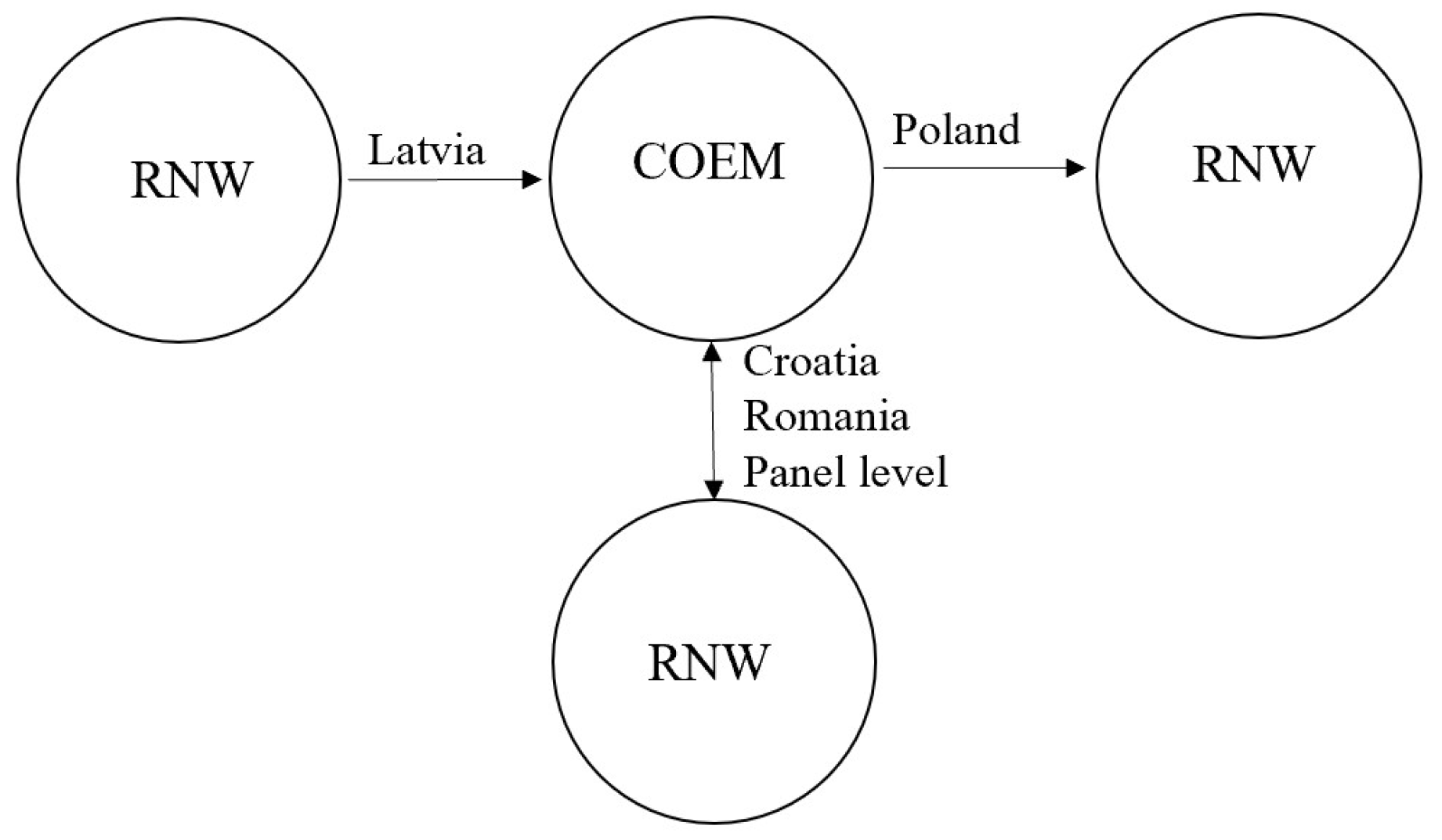 Figure 1. The panel-level findings demonstrate a bidirectional causal nexus between RNW and COEM. Nevertheless, the findings of the country-level causality test reveal a bidirectional causal relation between RNW and COEM in Croatia and Romania, a unilateral causal relation from RNW to COEM in Latvia, and a unilateral causal relation from COEM to RNW in Poland.