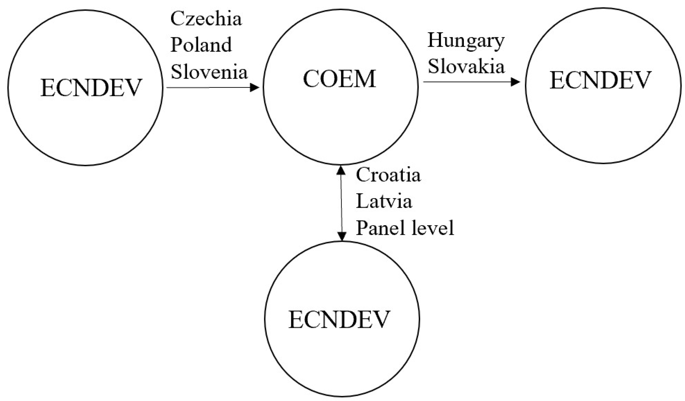 Figure 3. The panel-level findings demonstrate a bidirectional causal nexus between ECNDEV and COEM. Nonetheless, the findings of country-level causality test reveal bidirectional causality between ECNDEV and COEM in Croatia and Latvia, unilateral causality from ECNDEV to COEM in Czechia, Poland, and Slovenia, and unilateral causality from ECNDEV to HUMDEV in Hungary and Slovakia.