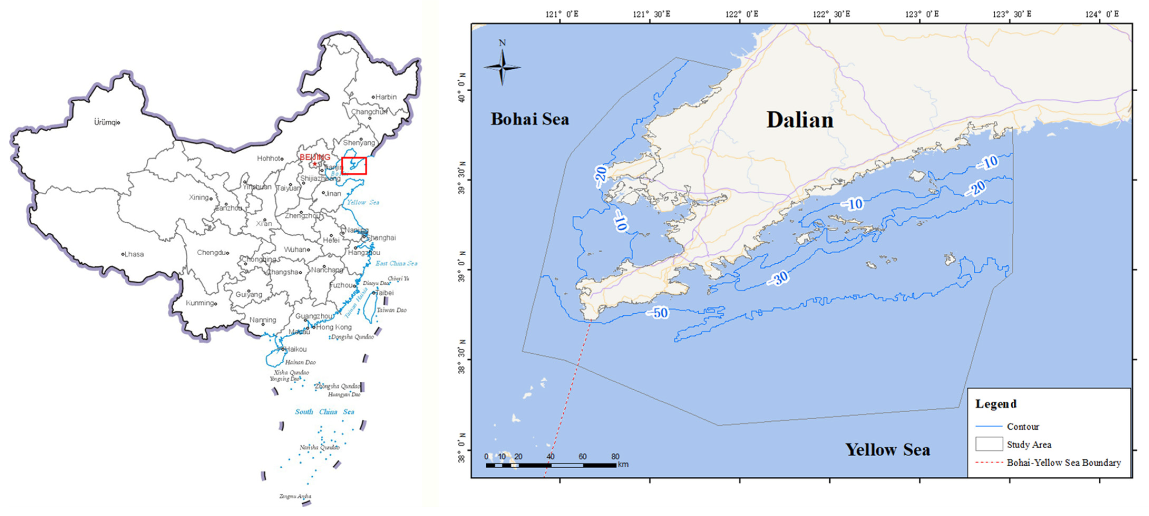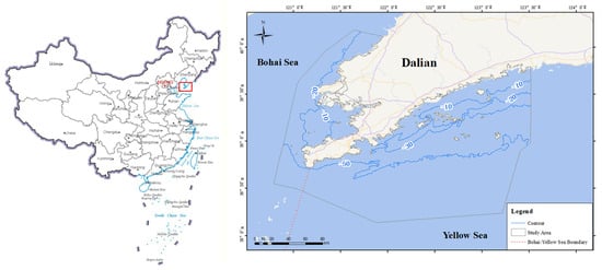 This study was carried out in the coastal waters of Dalian, Liaoning Province, China, located between 38°43′ N and 40°10′ N and 120°58′ E to 123°31′ E in the Bohai Sea and the Yellow Sea, covering an area of approximately 29,000 km2 (Figure 1). Dalian’s extensive coastline, exceeding 2200 km, and its more than 500 islands of varying sizes underscore the region’s rich marine resource endowment [].