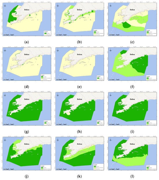 Furthermore, a multicriteria decision analysis approach was employed incorporating the status of regional development and utilization, to delineate an MSP scheme for Dalian’s coastal waters (Figure 6b and Table 4). According to the proposed scheme, Ecological Redline Zones and Ecological Control Zones comprise 22.0% and 32.4% of the marine area, respectively. Both offshore and coastal regions are included within these zones. Offshore areas are predominantly reserved for ecologically dominant functions, such as habitats of key protected species and fisheries resources, while coastal areas have been reconfigured to minimize high-intensity development conflicts and preserve critical estuaries, wetlands, and island-adjacent waters. As a result, some coastal zones have been reclassified to accommodate specific development purposes, including port and fisheries use. Notably, within the Marine Exploitation Zones, fisheries activities occupy a dominant position, covering 39.7% of the total area, while other development uses are largely concentrated along the coastline.