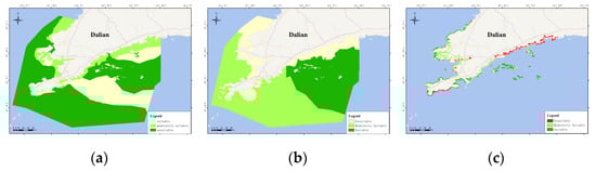Spatial suitability results of the weighting method in the coastal waters of Dalian for (a) marine ecological protection, (b) mariculture, and (c) port construction.