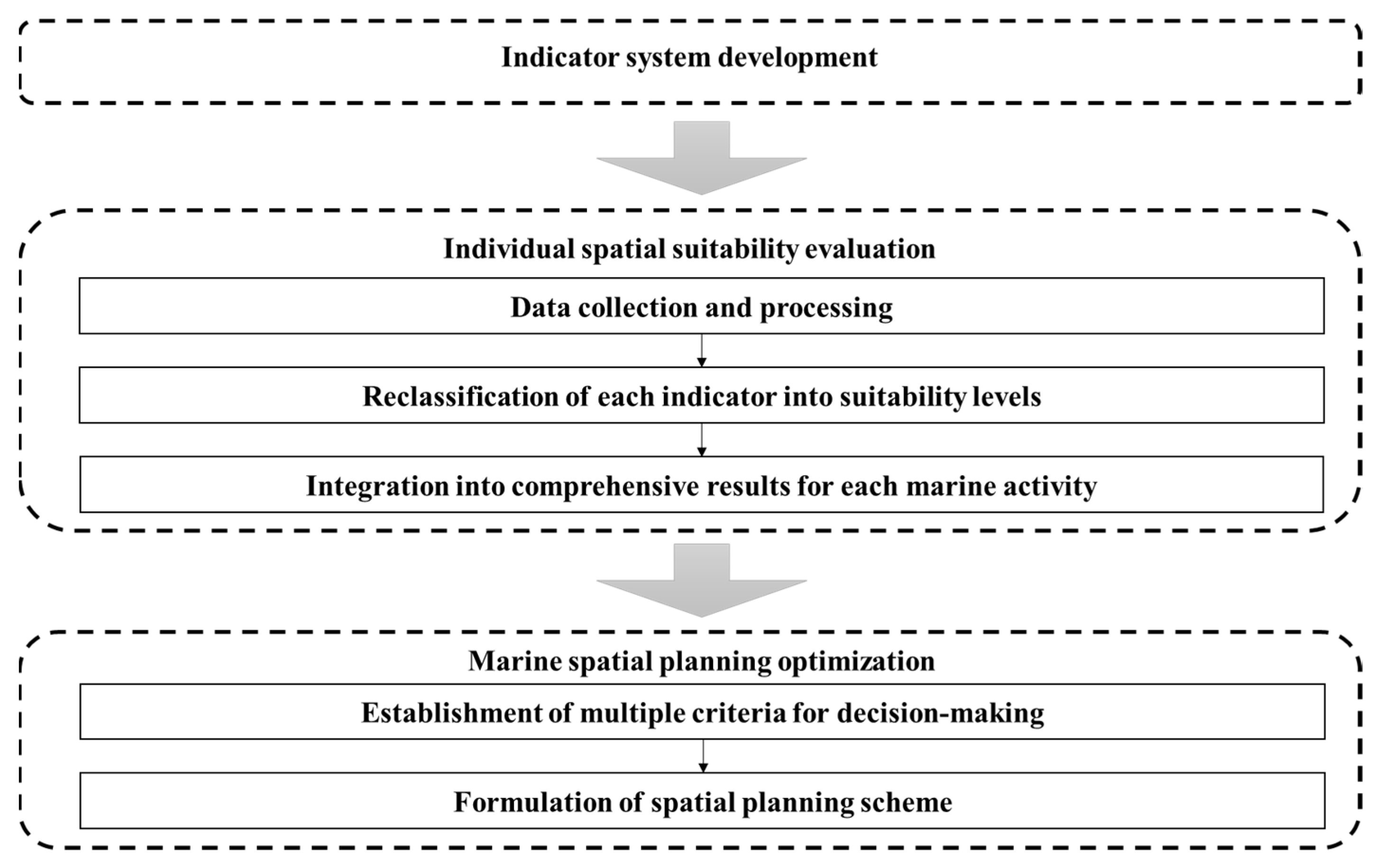 In this study, we propose an integrated analytical framework for multi-objective spatial suitability evaluation to optimize MSP schemes. The spatial suitability of key marine activities in the coastal waters of Dalian (China) was evaluated using a comprehensive indicator system, and the optimized MSP scheme was derived. Our approach incorporates the latest spatial management strategies in China and addresses multiple real-world demands by balancing ecological, economic, and social factors, thereby providing insights for the resolution of multi-use conflicts and the implementation of science-based MSP.