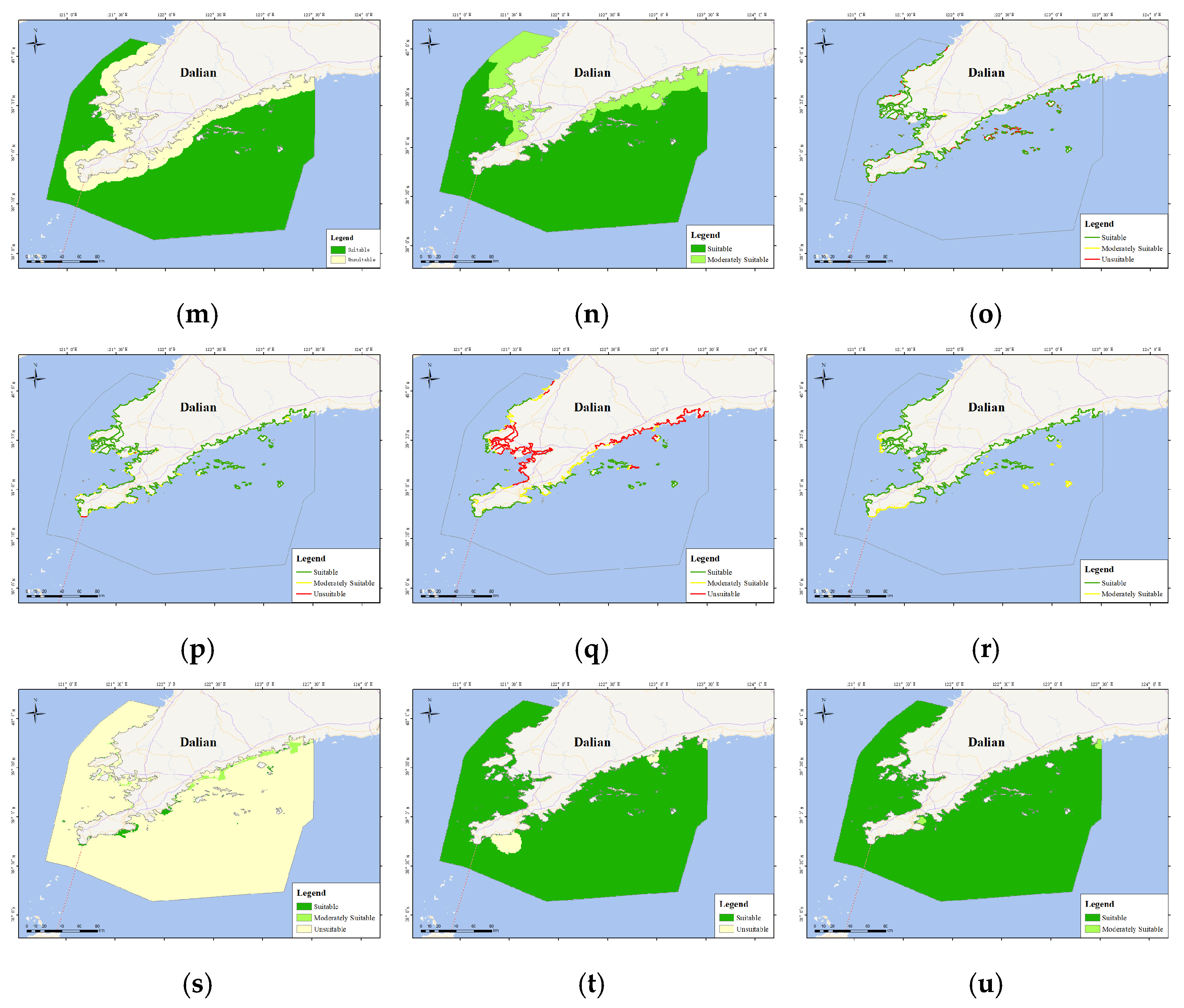 Spatial distribution of suitability evaluation results for individual criteria of marine ecological protection ((a): habitats of key protected or threatened species, (b): habitats with high biodiversity or productivity, (c): critical habitats supporting key life-history stages of species, (d): habitats offering coastal protection service, (e): habitats offering carbon sequestration service), and for individual indicators of mariculture ((f): phytoplankton abundance, (g): substrate type, (h): seawater quality, (i): red tide risk, (j): sea ice risk), wind energy farm development ((k): wind energy density, (l): water depth, (m): distance to shoreline, (n): sea ice risk), port construction ((o): shoreline substrate type, (p): slope, (q): water depth, (r): storm surge risk), coastal tourism ((s): tourism resources, (t): seawater quality, (u): red tide risk) in the coastal waters of Dalian, China.