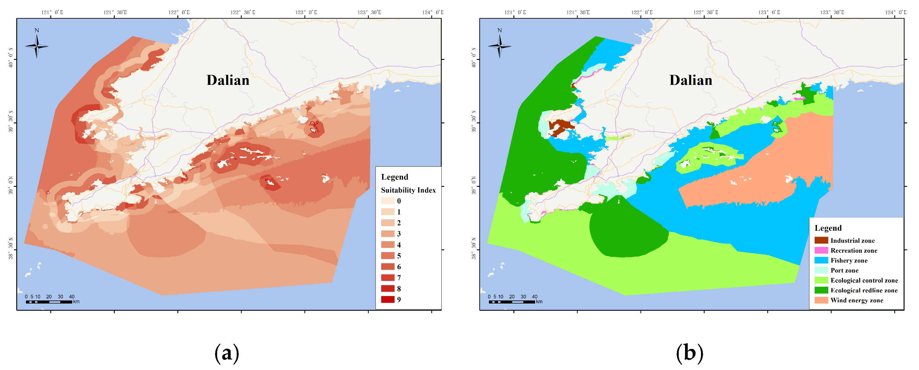 Map of marine spatial suitability index (a) and marine spatial planning optimization scheme (b) in the coastal waters of Dalian, China.