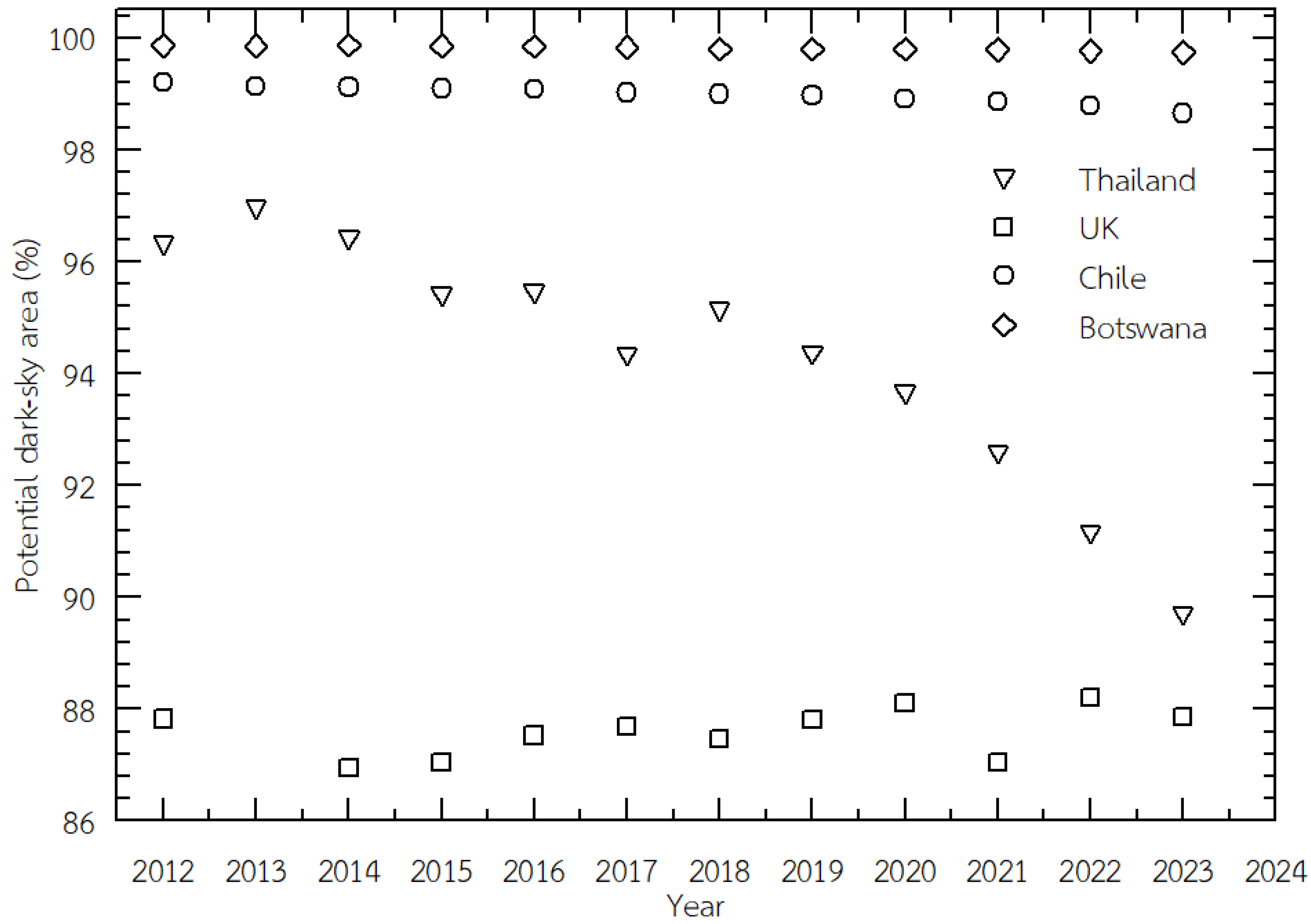 Surina, F.; Changruenngam, T.; Waikeaw, J.; Nanglae, S.; Poshyachinda, S.; Soonthornthum, B.; Bode, M.F. The First Dark-Sky Map of Thailand: International Comparisons and Factors Affecting the Rate of Change. Sustainability 2025, 17, 9856. https://doi.org/10.3390/su17219856