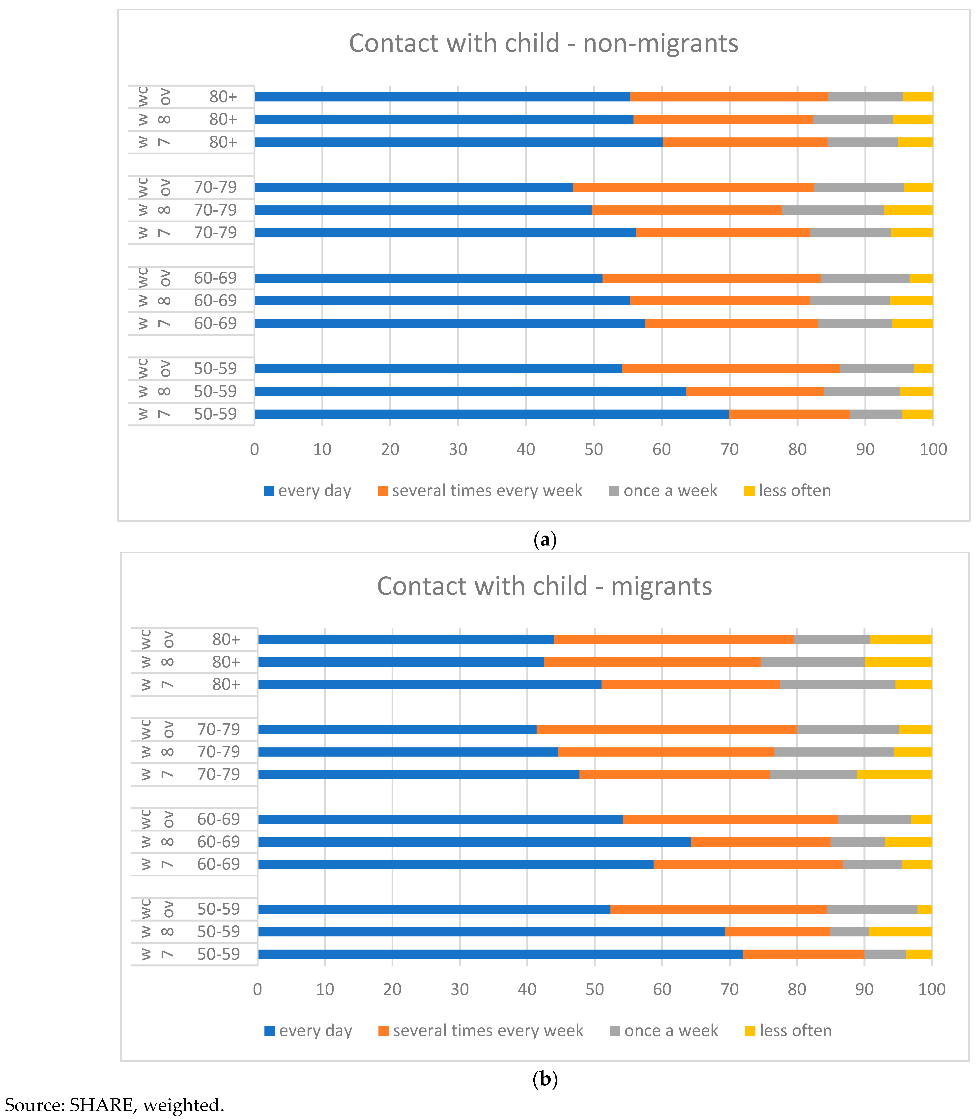 Table 2). The effect sizes are 0.040 in Wave 7, 0.092 in Wave 8 and 0.066 in the COVID-19 wave; they can be described as weak effects and they do vary only slightly. That is, the difference between the elderly non-migrant and migrant population is comparatively small when it comes to frequency of contact with adult children, as in both groups, the frequency of contact with children is on average very high (in the subpopulation analysed—individuals aged 50 and above who have at least one child and some contact with the child)—with migrants having even slightly more contact. While this is somewhat contrary to our observation in the descriptives (