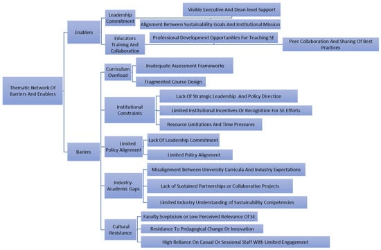 To illustrate the relationships identified through thematic coding, Figure 1 presents the Thematic Network of Barriers and Enablers generated in NVivo 14. The diagram visualises how participants’ narratives clustered around two overarching domains, Barriers (institutional constraints, curriculum overload, cultural resistance, and weak industry–academic linkages) and Enablers (leadership commitment and educator training and collaboration). Each domain is further divided into subthemes that represent the structural, cultural, and pedagogical factors shaping sustainability education within Australian hospitality programmes.