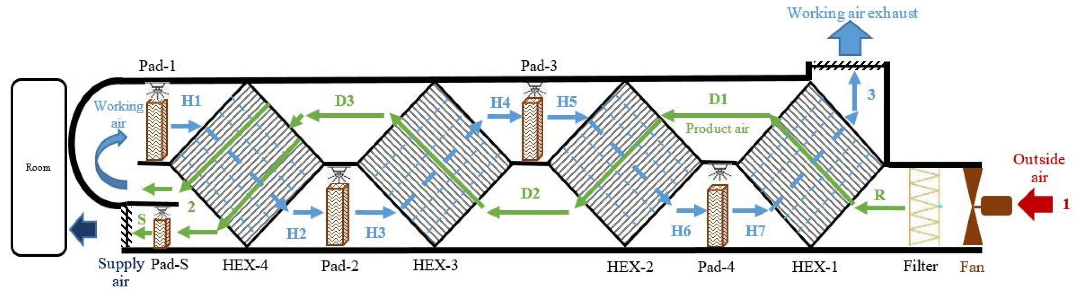 - Elsheniti, M.B.; Al Fardi, N.; Zeitoun, O. Thermal performance assessment of an innovative multistage indirect evaporative cooler designed to supply fresh and hygienic air. Case Stud. Therm. Eng. 2025, 74, 107037. [Google Scholar] [CrossRef]