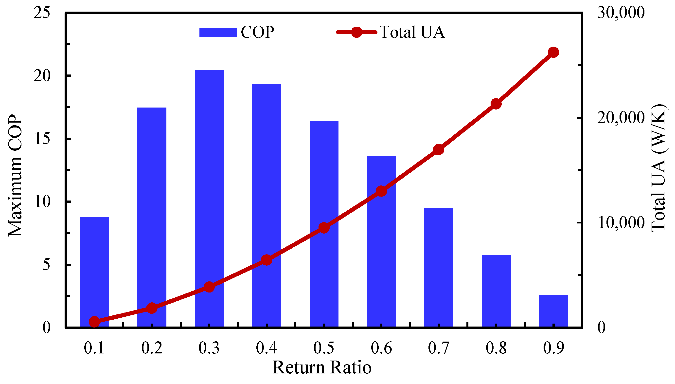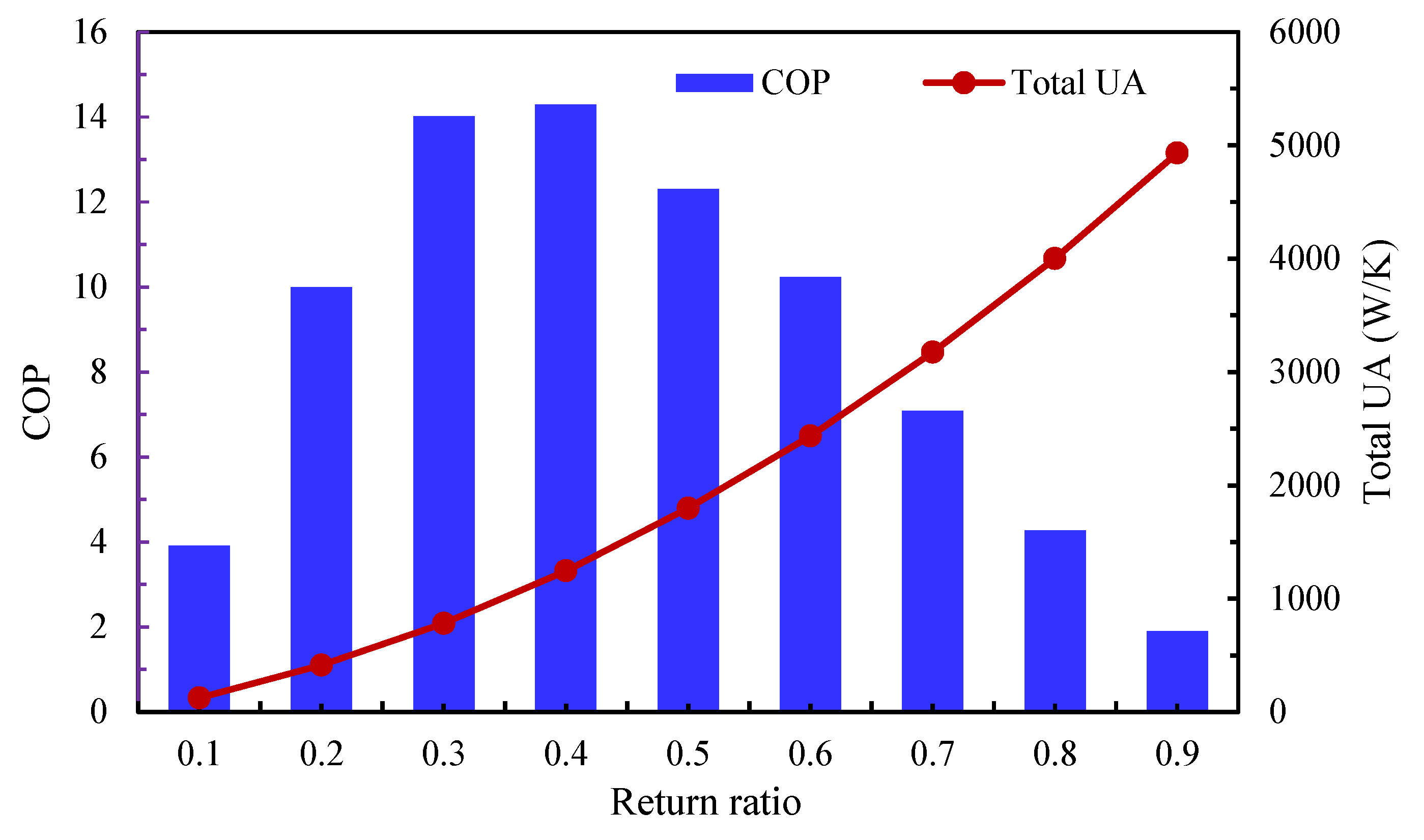 - The maximum COP increased from 14.3 in the base case (RR = 0.4) to 20.4 in the optimized case (RR = 0.3), corresponding to a 42.7% improvement, while total power consumption decreased by up to 55.3% at RR = 0.1. However, these gains were accompanied by a threefold increase in total UA, rising from 1245.4 W/K in the base case to 3856.8 W/K in the optimized case, highlighting the trade-off between energy efficiency and system size.