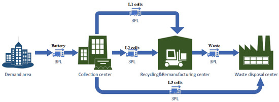 - Third-party logistics (3PL) construction costs: Fixed costs associated with the selection of transportation paths among demand regions, collection centers, remanufacturing centers, and disposal centers;