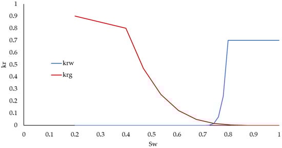 Reservoir permeability in horizontal directions was modeled with a log-normal distribution, using a mean value of 5 mD with a standard deviation of 1 mD, while vertical permeability was also described with a log-normal distribution, but with the mean and standard deviation being 10 times smaller. Correlations were used for rock compaction [], relative permeability (using Corey exponents that are typical for natural gas reservoirs, Figure 4), and brine properties (based on water salinity of 30,000 ppm).