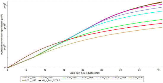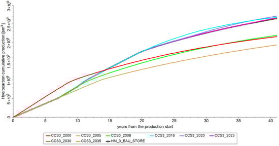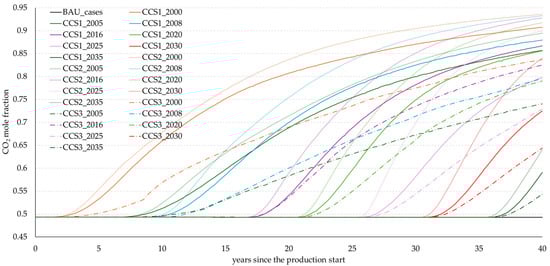 For cases where injection wells are B-8 and B-9 (strategies CCS1 and CCS2), the base-line scenarios (BAU) have the highest cumulative hydrocarbon gas (without CO2) production, with the exception of the latest timing (35 years after the production start). This can be attributed to minimal fluid contamination. However, for the scenarios where the injection starts simultaneously with production (CCS1_2000 and CCS2_2000, and also CCS3_2000), hydrocarbon gas production in the first fifteen years is greater than the corresponding base cases. Cumulative production at the end of the observed period is still lower compared to the base cases. This can be attributed to the earlier breakthrough of CO2. Nevertheless, cumulative productions that are similar to BAU scenarios are noticed in scenarios where the injection is started only after the reservoir depletion (CCS1_2030 and CCS1_2035, and CCS2_2030 and CCS2_2035). This is in line with the findings from the literature [,], where the simulations implied that it is desirable to deplete the reservoir as much as possible prior to the implementation of EGR (when the goal is to maximize natural gas production, i.e., recovery).