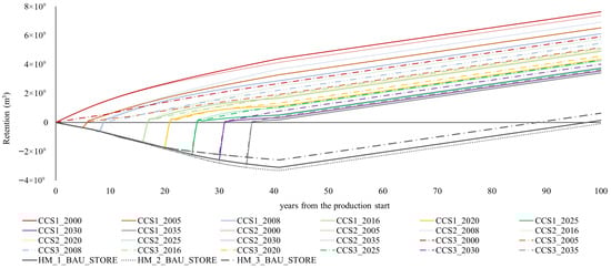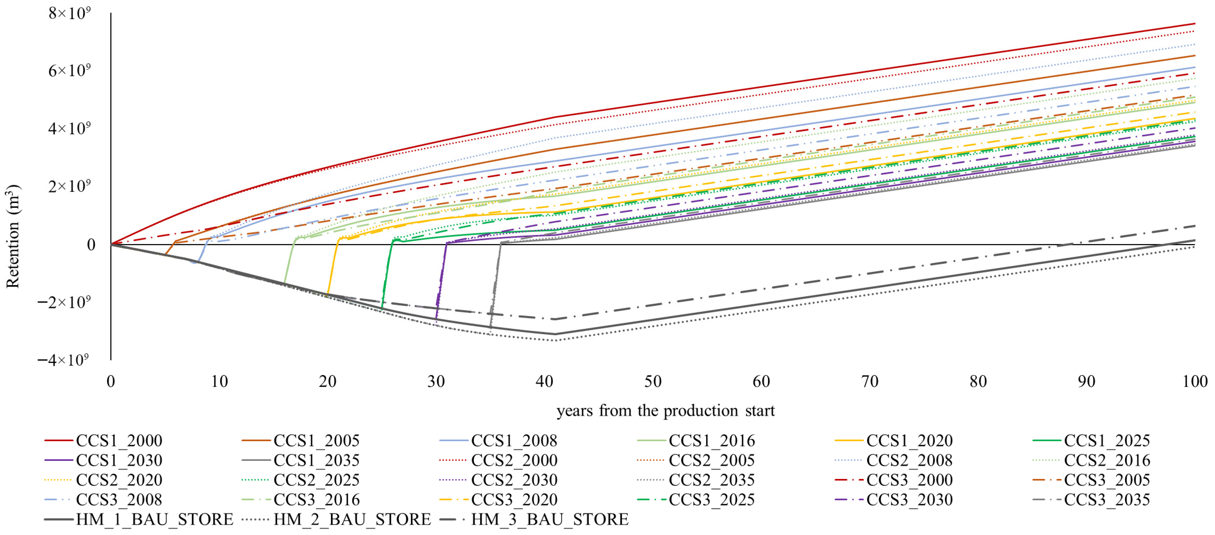 Retentions follow the same trend in all strategies, but their values vary because of the different quantities of the produced and injected CO2. All scenarios that include both injection and production have positive retentions from the start of injection.