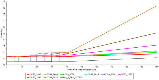 In the production period of CCS1 scenarios (Figure 11), better results for storability were generally observed for an earlier injection start, which is in accordance with retention results for these cases. It was noticed that storability decreases with time in the production phase, and this can be attributed to an increase in CO2 breakthrough.