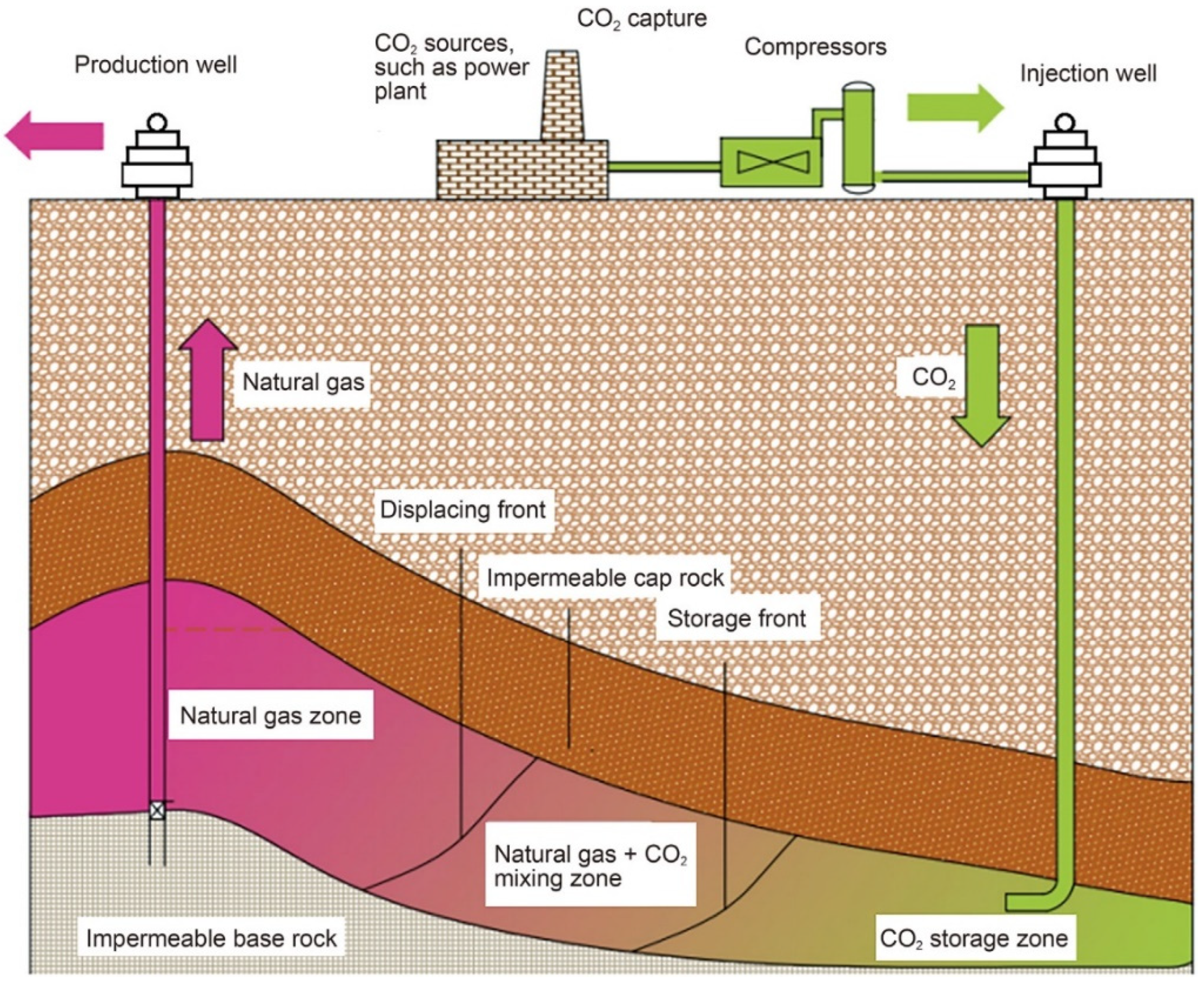 2 (due to its density) to sink towards the reservoir bottom. This way, a “gas cushion” is formed that can enhance the production of natural gas through piston-like displacement (