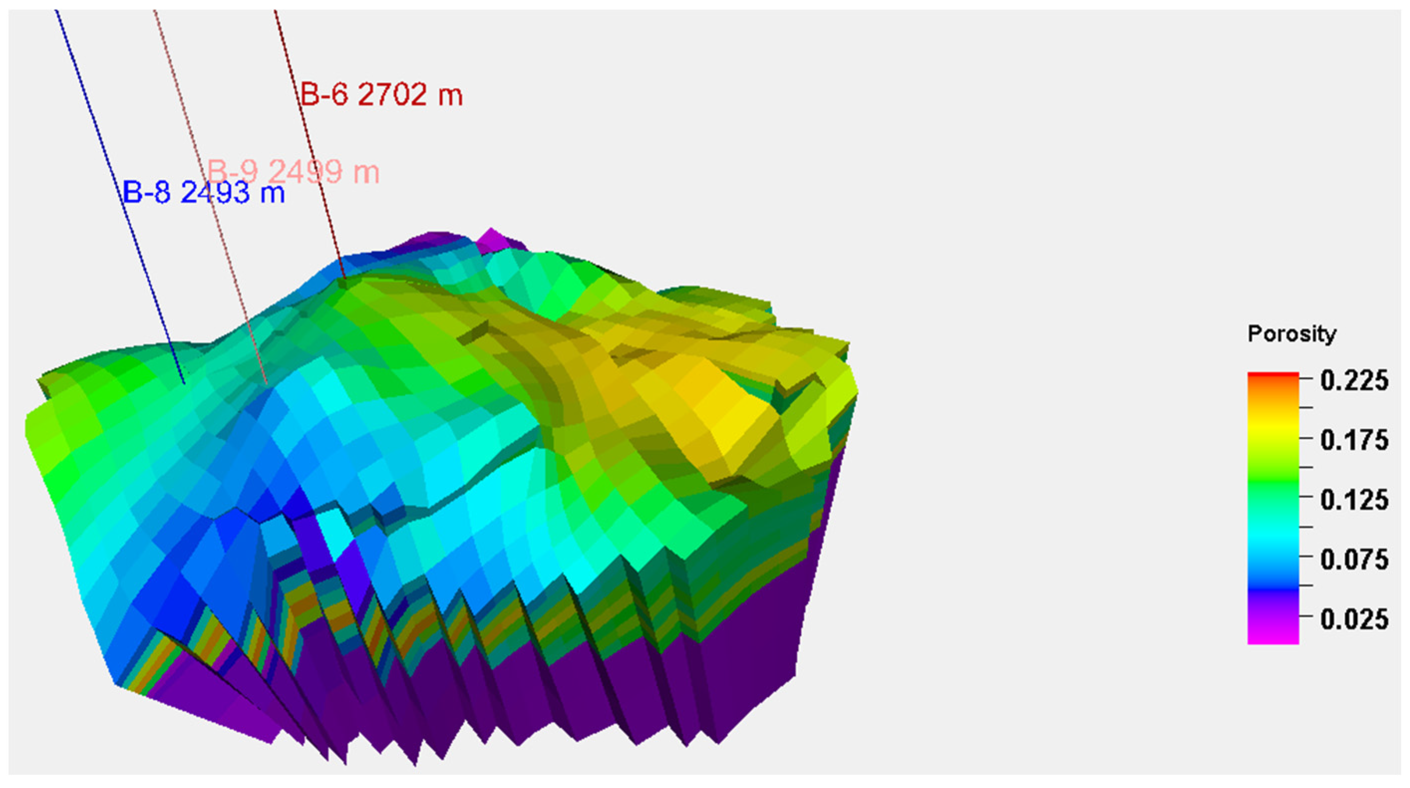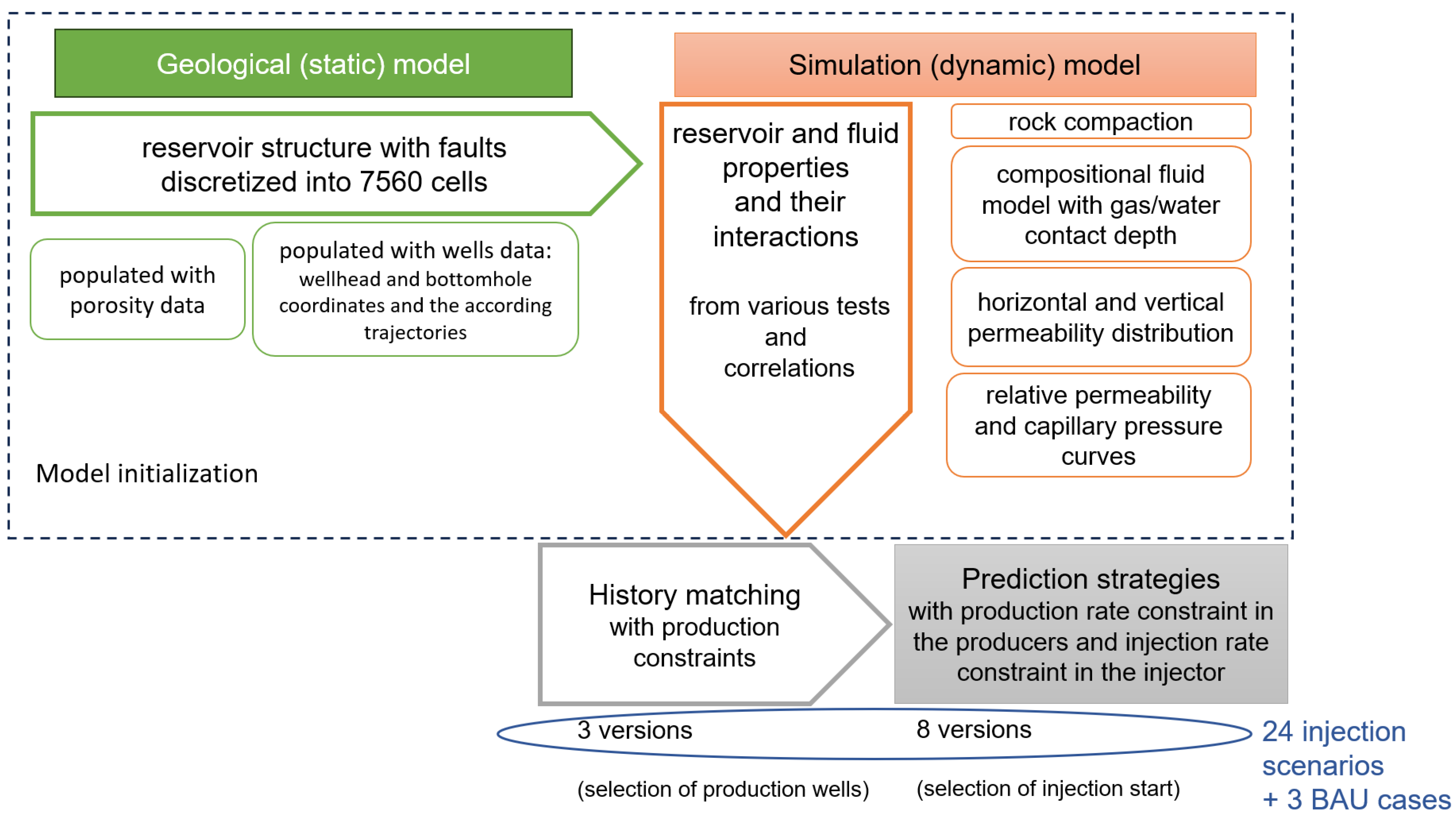 A geological model of a producing reservoir was built with Schlumberger Petrel software (version 2024.4), which is also used to run compositional Eclipse (E300) implicit simulations [
