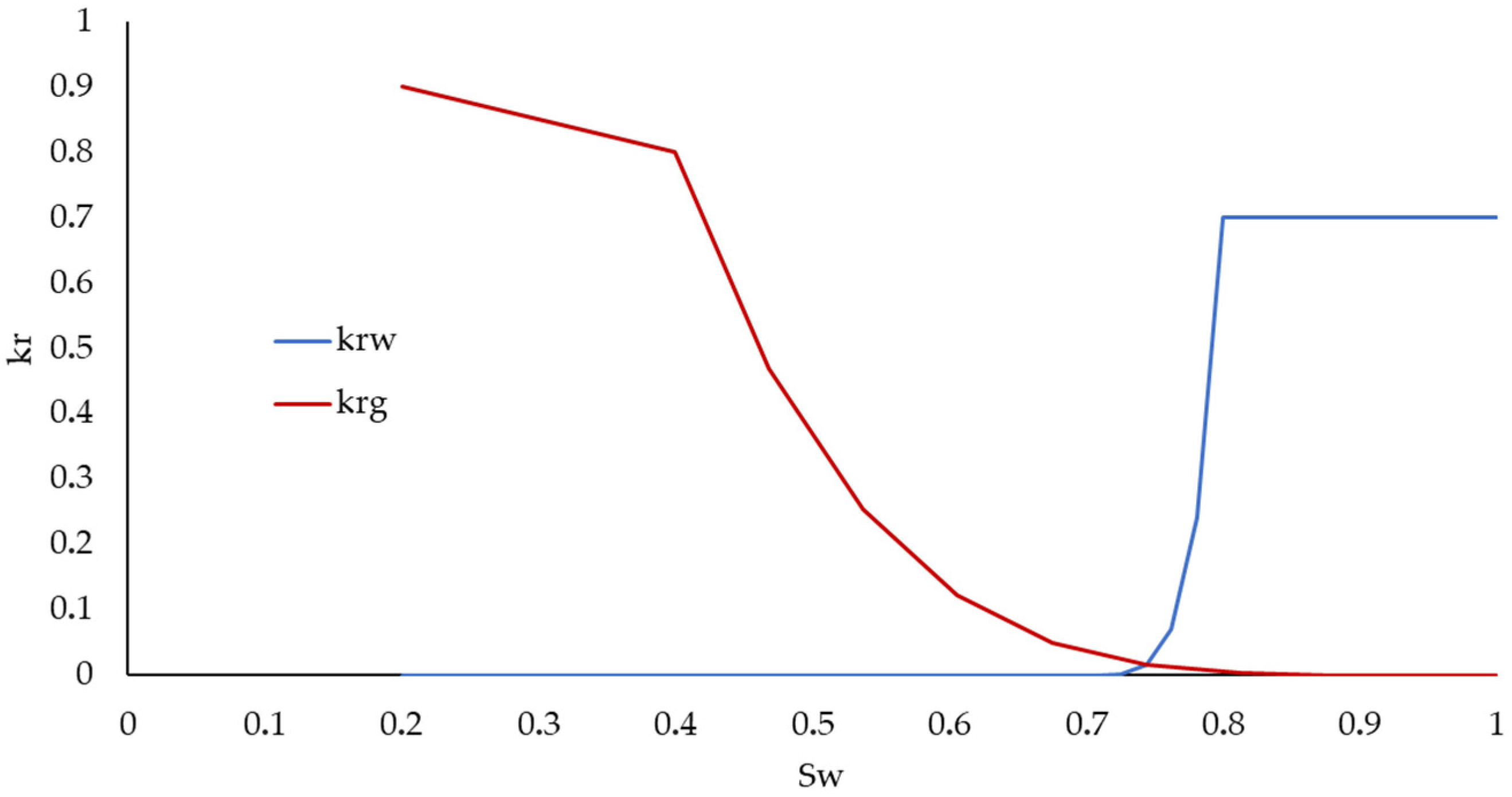 36]. The injectivity primarily depends on reservoir permeability, effective layer thickness, heterogeneity, and reservoir and injection pressure. Relative permeability for CO