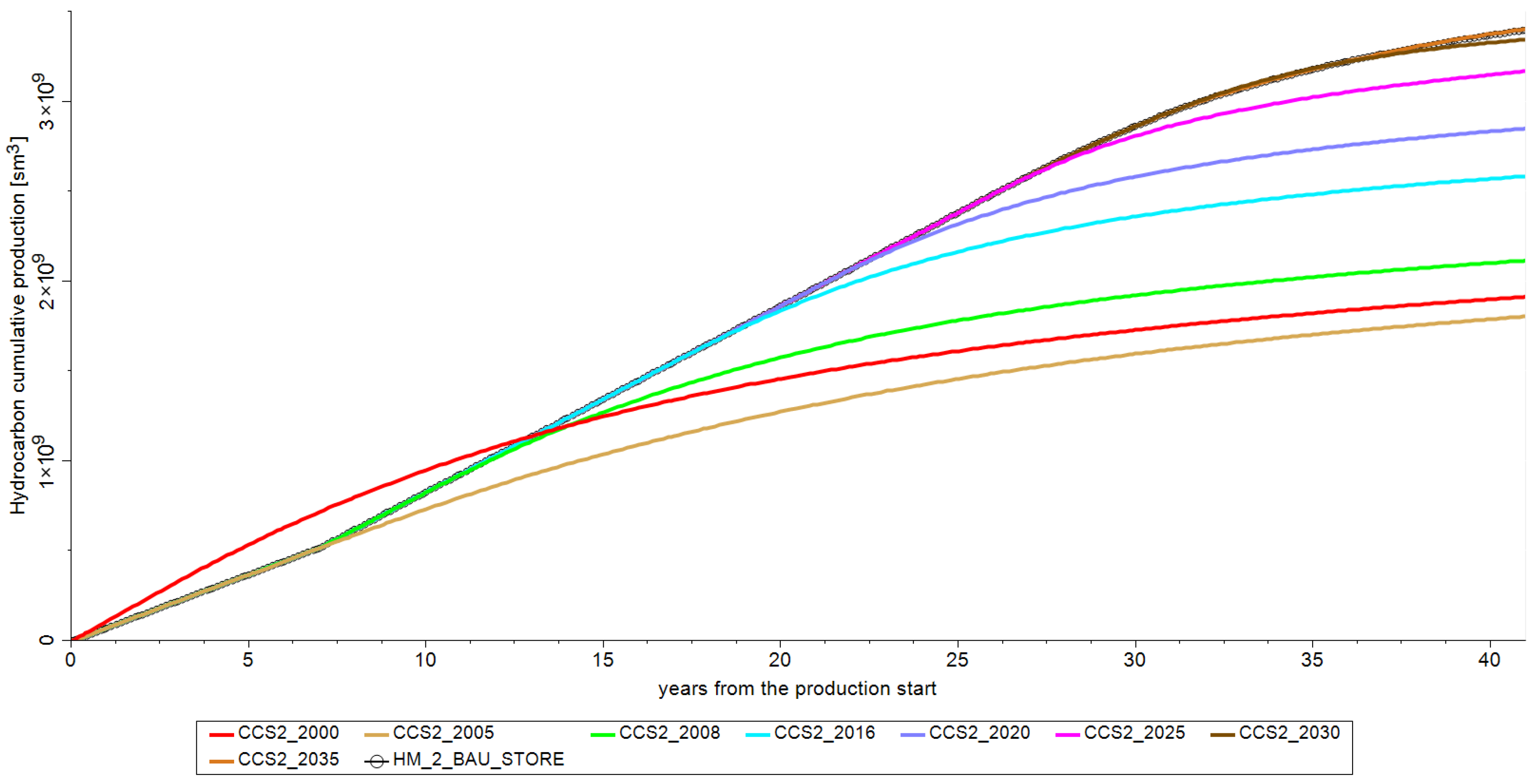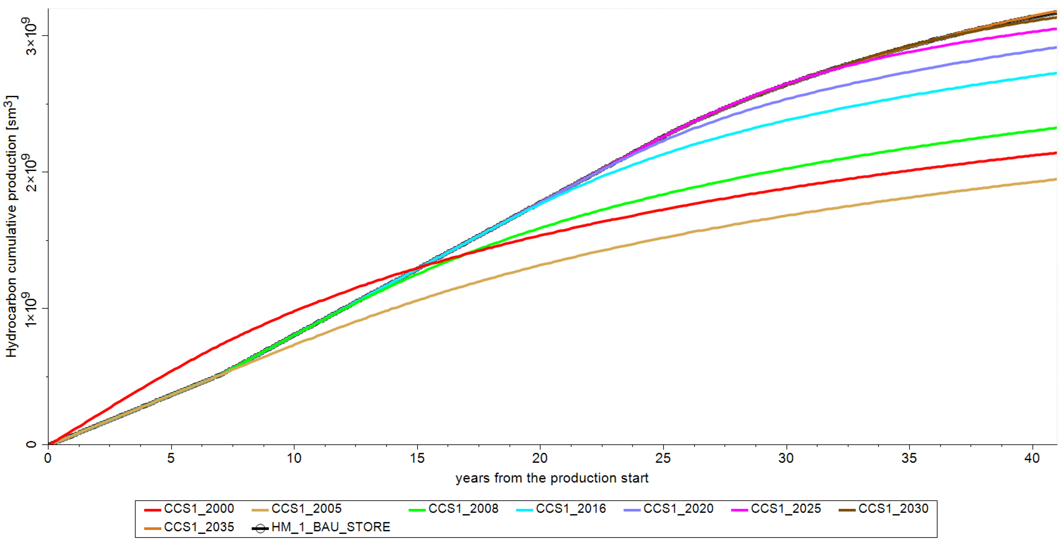 2. Nevertheless, cumulative productions that are similar to BAU scenarios are noticed in scenarios where the injection is started only after the reservoir depletion (CCS1_2030 and CCS1_2035, and CCS2_2030 and CCS2_2035). This is in line with the findings from the literature [