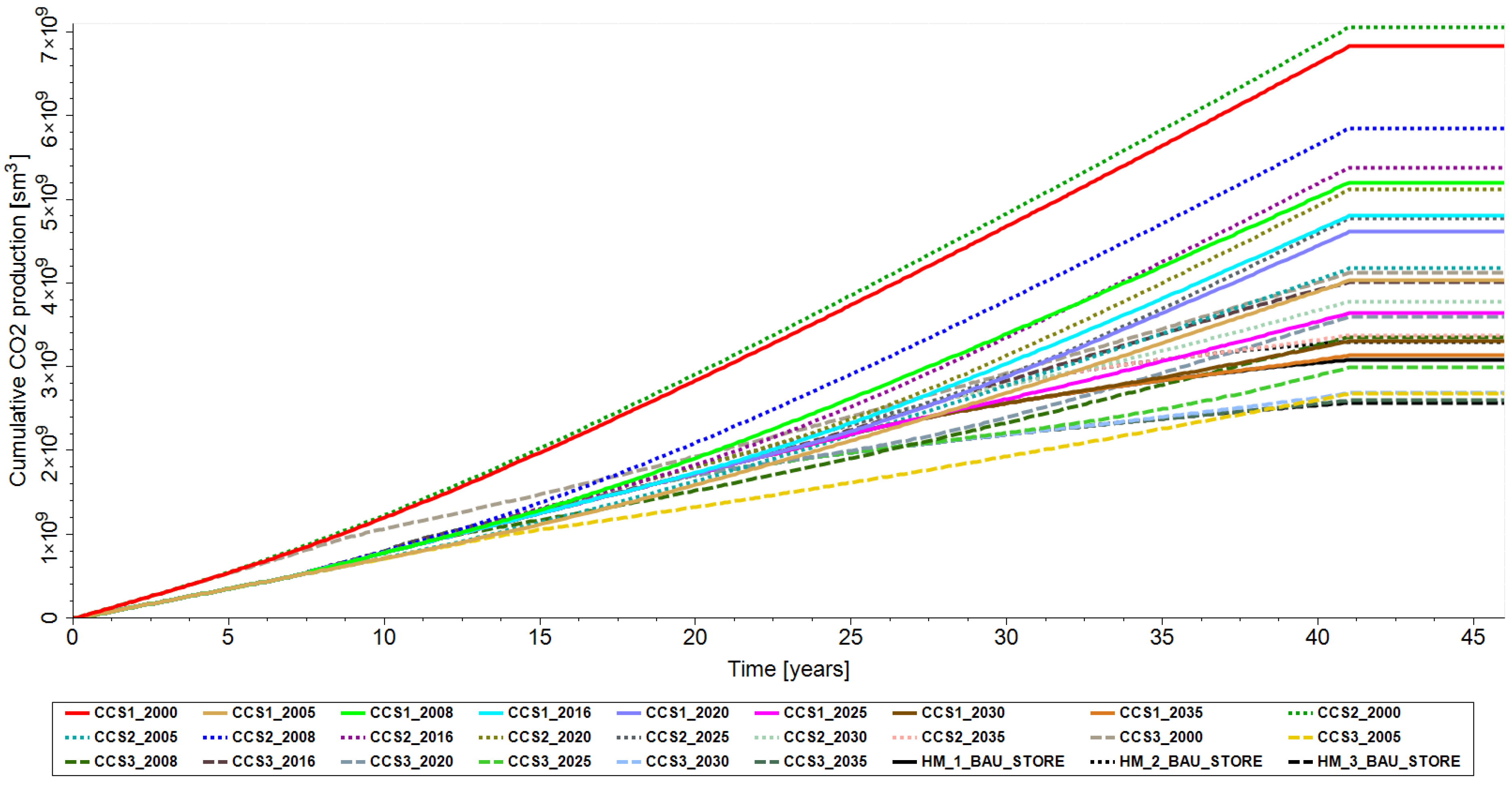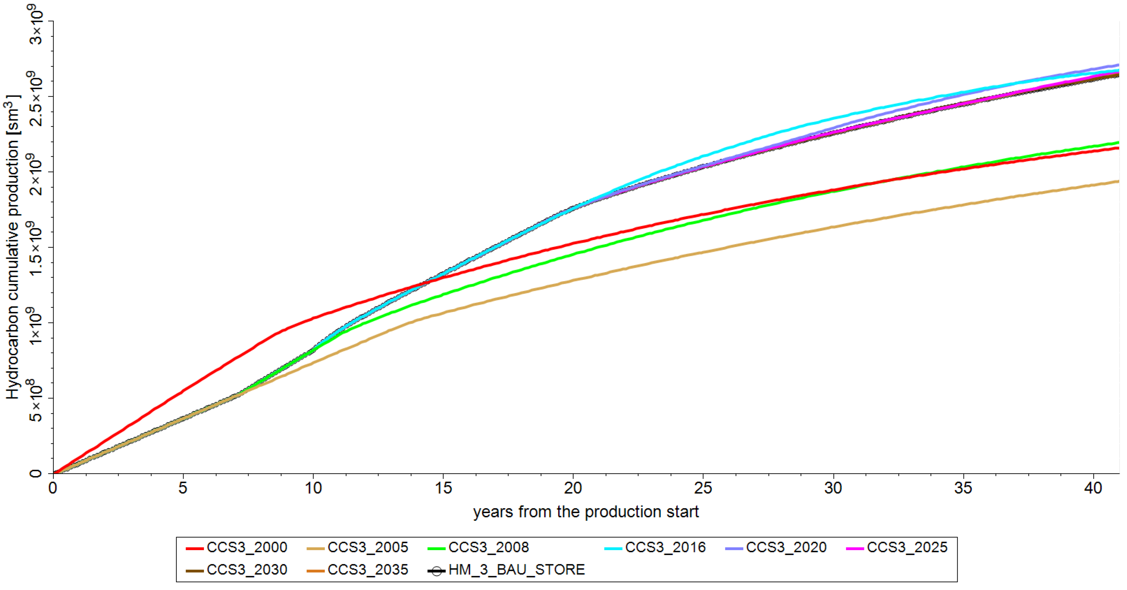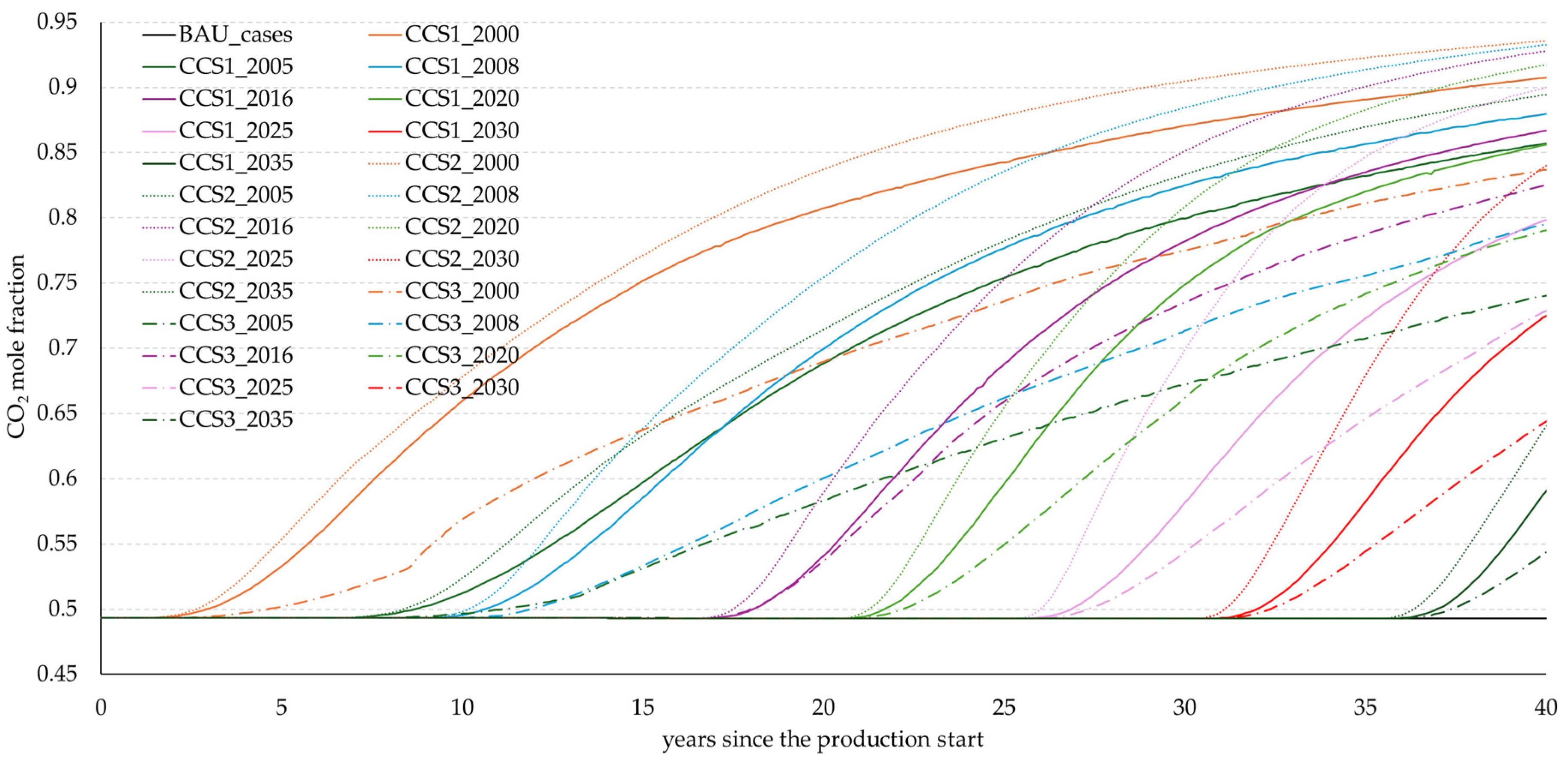 2) production, with the exception of the latest timing (35 years after the production start). This can be attributed to minimal fluid contamination. However, for the scenarios where the injection starts simultaneously with production (CCS1_2000 and CCS2_2000, and also CCS3_2000), hydrocarbon gas production in the first fifteen years is greater than the corresponding base cases. Cumulative production at the end of the observed period is still lower compared to the base cases. This can be attributed to the earlier breakthrough of CO