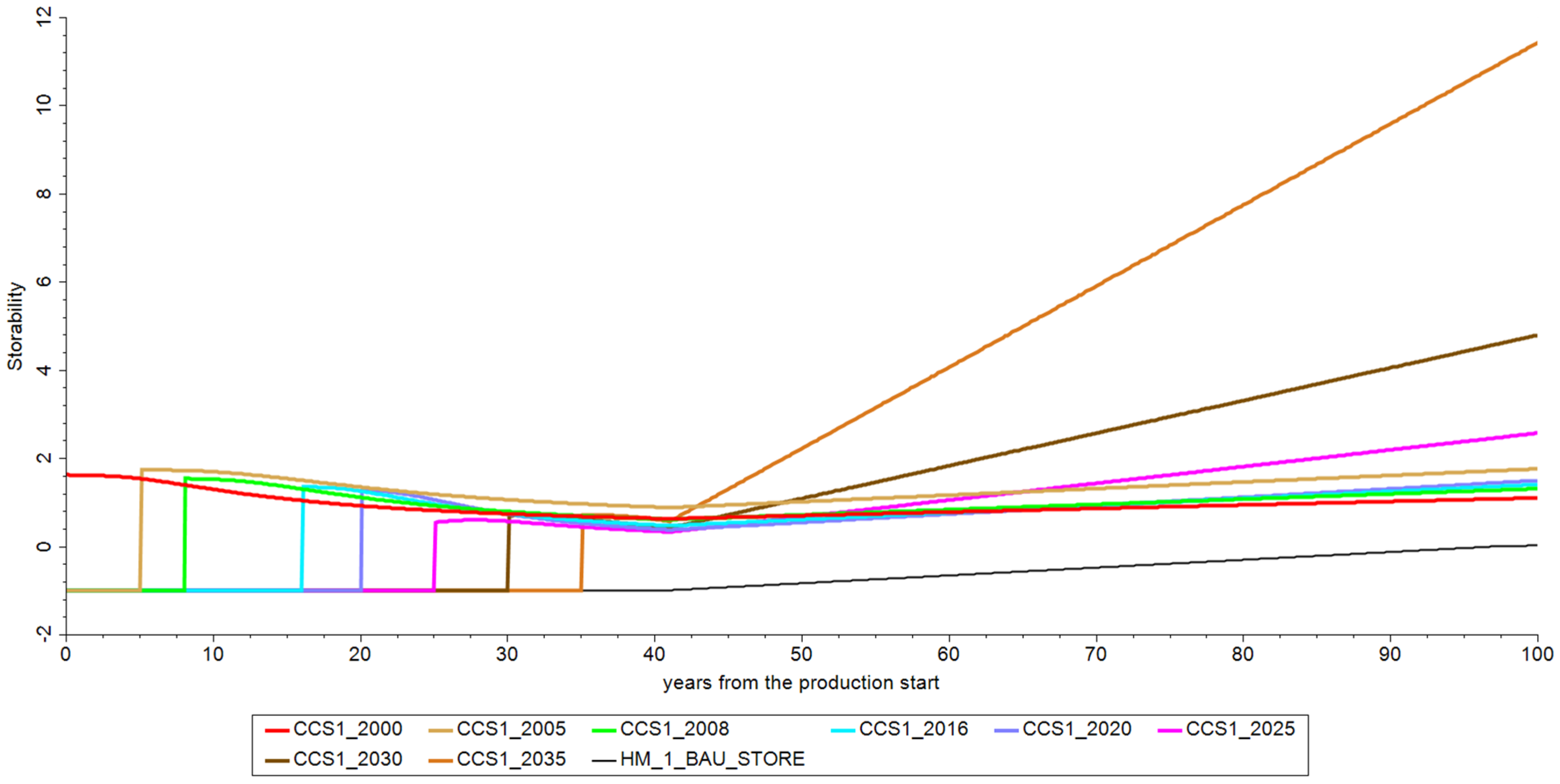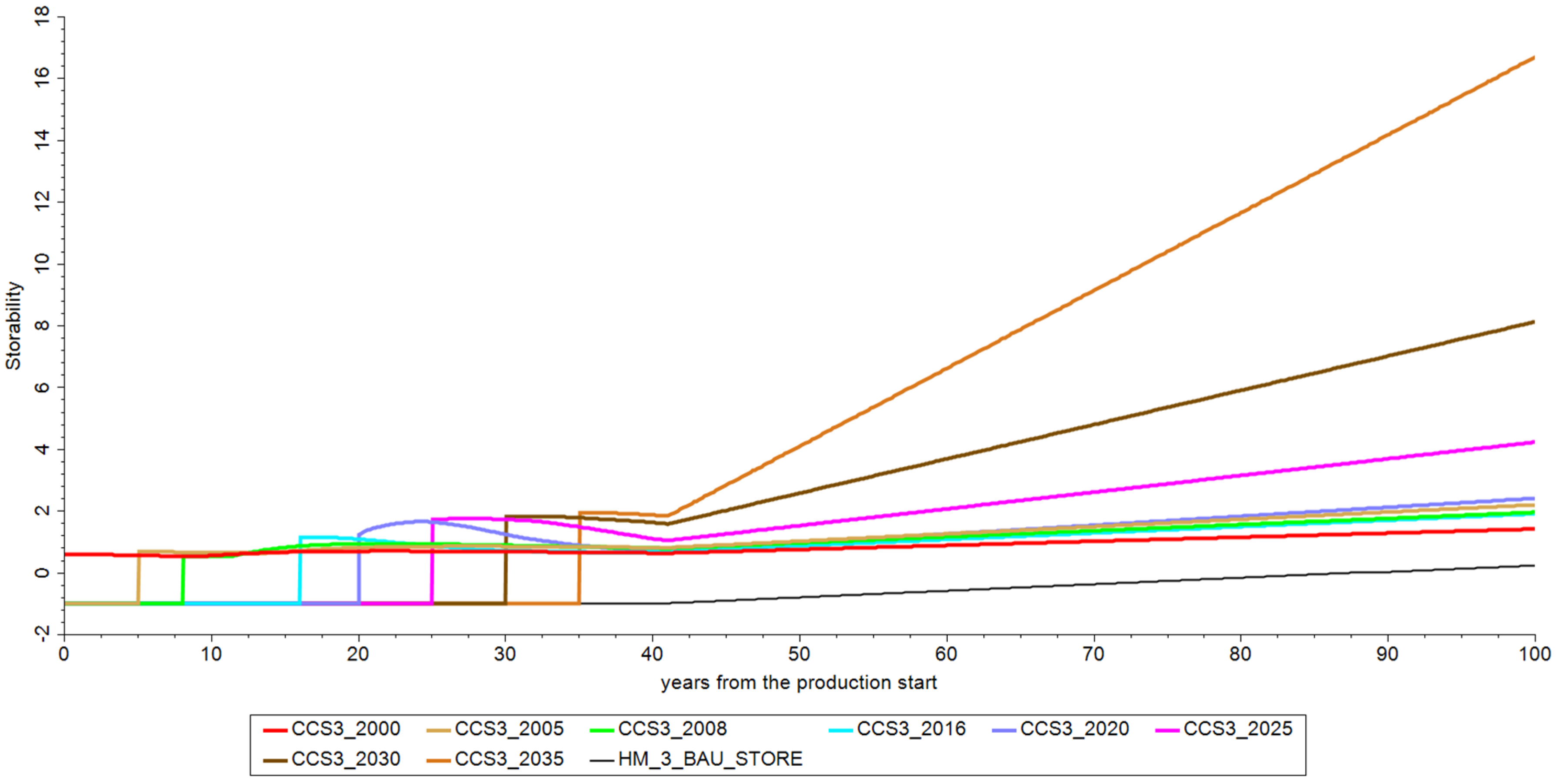 The ‘pure’ storage phase scenarios with later injection starts yielded the best storability results. This can be attributed to a fast decrease in CO2 production and a somewhat slower increase in the retention. The highest storability for all wells’ arrangements (CCS1, CCS2, CCS3) is achieved in scenarios with the latest injection start, and it is significantly higher than in cases with earlier injection starts.