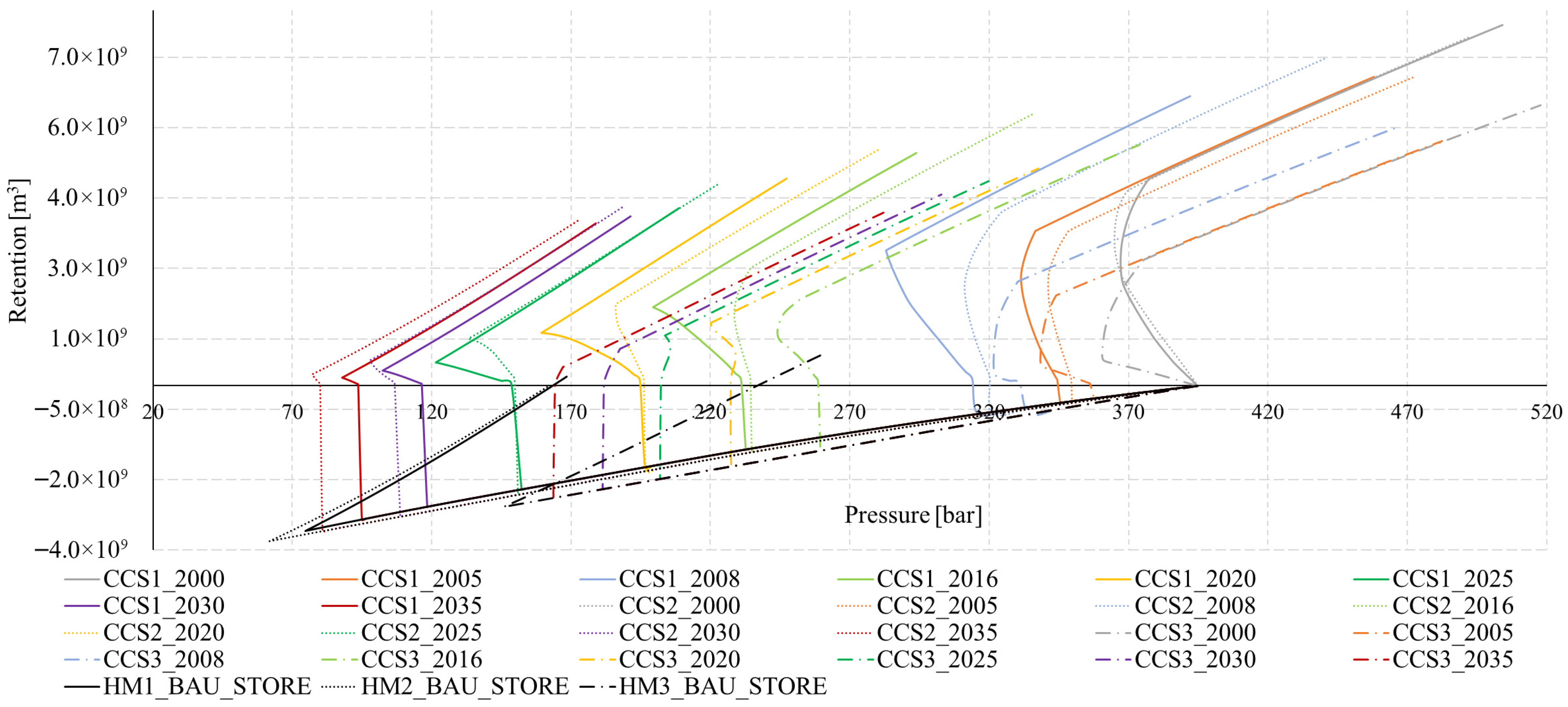 2 storage potential, can be assessed by analyzing the pressure–retention relationship for each scenario. Because of the high CO