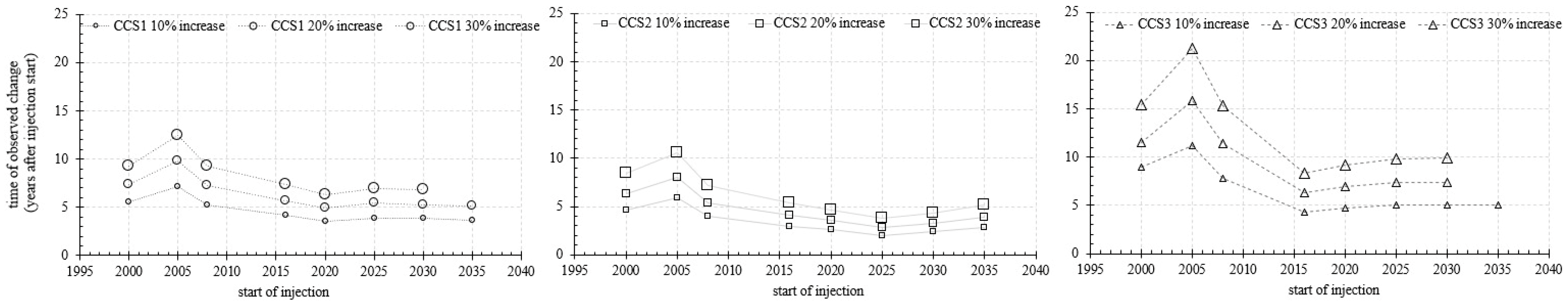 2 fraction in the CCS2_2030 scenario exceeded 80% less than 10 years after the injection start. It is therefore useful to detect the times of significant increase in the CO