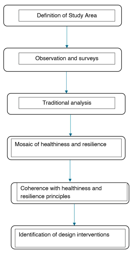 They are now increasingly regarded as complex environments that influence psychological and physical well-being, quality of life, and the sociality of academic communities. Within this framework, it becomes necessary to employ a methodology conceived as an innovative tool for the analysis, design, and transformation of university public spaces. This methodology is grounded in an integrated approach that combines direct surveys, cartographic tools, and universal principles of healthiness and urban liveability [40]. The methodological framework is articulated into six sequential phases, designed to ensure a logical progression from observation to design proposal.