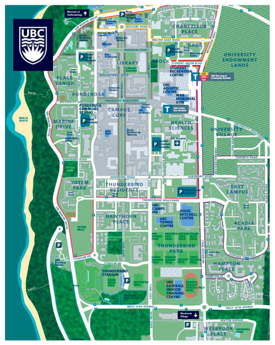 UBC Campus plan (Source: https://maps-vancouver.com/ubc-campus-map, accessed on 30 October 2025).