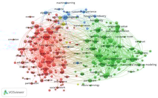 Within Cluster 3, only Artificial Intelligence and Consumer Experience exhibit correlations with the initial two clusters, indicating a more focused examination of the application of AI within the consumer experience in the hospitality sector. Artificial intelligence is presently a topic of significant interest and is associated with elements such as robotics, customer experience, the hospitality industry, and insights pertaining to hospitality. This underscores the current relevance of AI in the context of hospitality and customer experience. A dominant term is Artificial Intelligence (AI) with 937 links; other important keywords are as follows: Consumer Experience (400), Robot (251), Algorithms (491), and Hospitality Industry (441). This cluster signifies a highly specialized research front, concentrating on the application of advanced technologies, specifically artificial intelligence and robotics, within the context of direct interaction services in the hospitality industry and customer experience. This theme applies and transposes the concepts of systems and factors, as discussed in Clusters 1 and 2, into a specific business framework. The analysis examines how algorithms and robotics fundamentally reshape the customer experience.
