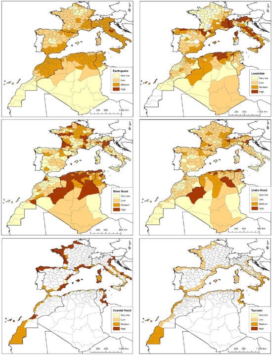 Likelihood of natural hazards (seismic, geomorphic, and hydrologic) in Western Mediterranean countries. Spatial distribution of hazard exposure at the provincial level, based on data from the Global Facility for Disaster Reduction and Recovery (GFDRR) website (https://thinkhazard.org/ (accessed on 21 April 2024) ).
