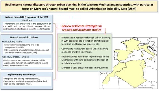 Resilience through urban planning has gained prominence since the adoption of the Sendai Framework for Disaster Risk Reduction (2015–2030), particularly in regions exposed to multiple natural hazards. This study examines how six Western Mediterranean countries—Spain, France, Italy, Tunisia, Algeria, and Morocco—address disaster risk prevention through urban and spatial planning. Although these countries share a similar geodynamic and climatic context, their approaches to integrating hazard prevention into planning frameworks vary significantly due to institutional, technical, and legal factors. Special attention is given to the case of Morocco, where delays in hazard integration are evident, particularly in the Maghreb region. Limited access to historical data, weak inter-agency coordination, and insufficient scientific capacity hinder effective planning. In response, Morocco has developed the Urbanization Suitability Map (USM) program, a non-binding planning tool inspired by the French Natural Risk Prevention Plan (PPRN). The USM tool overlays hazard information to guide land use decisions and mitigate risks such as floods, landslides, and seismic activity. Using a qualitative comparative analysis of regulatory texts, national planning strategies, and mapping instruments, this study identifies contrasting levels of disaster risk reduction integration across the six countries. The Moroccan USM initiative stands out as a pragmatic response to governance gaps and offers a transferable model for other countries with similar constraints. The findings underscore the need for clearer legislation, improved data systems, and multi-level coordination to enhance urban resilience. Recommendations are provided to strengthen hazard-informed planning practices and support more adaptive and sustainable land management in risk-prone areas.