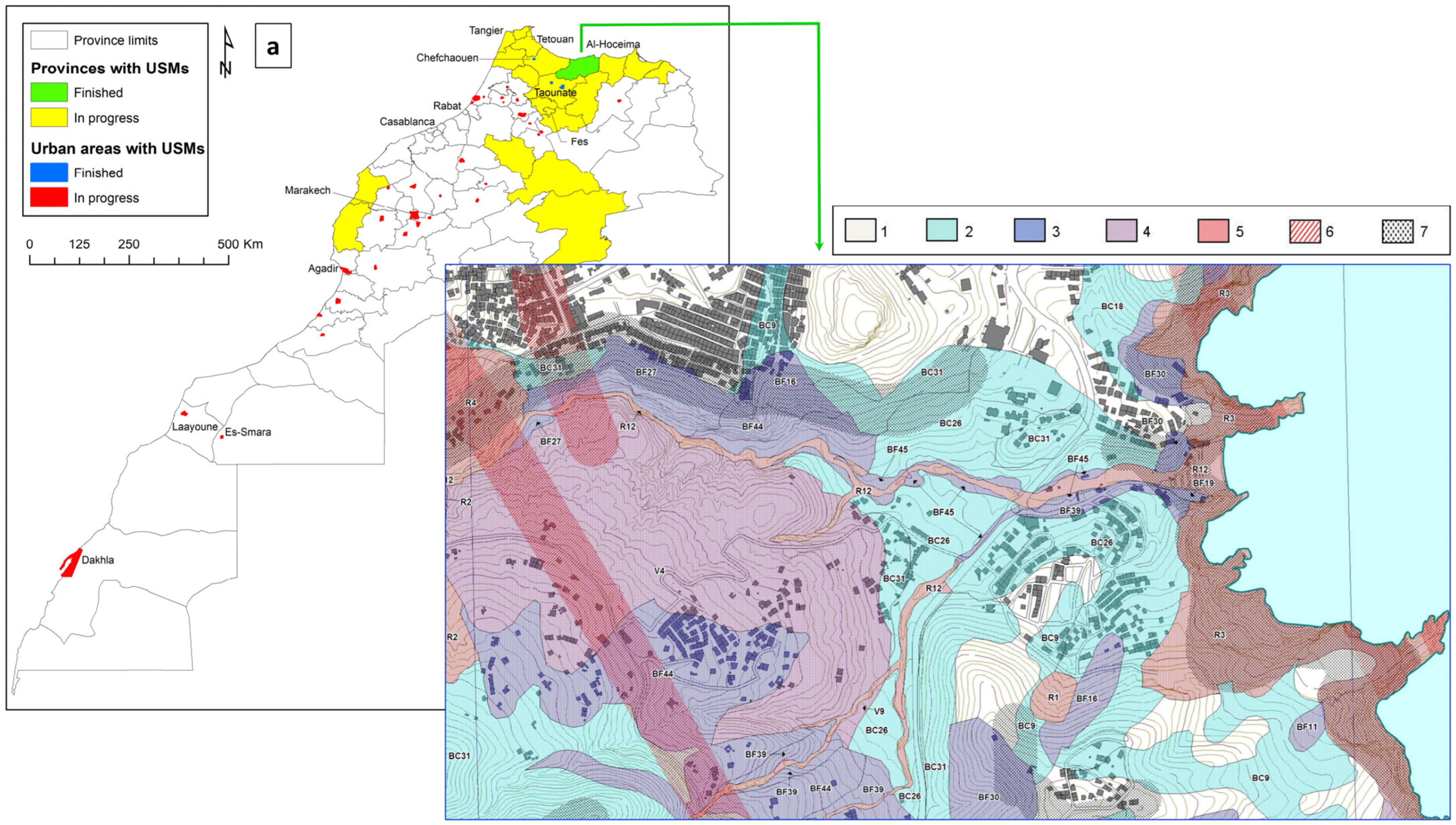 - Incompatibility of scales: The scale of production of the USM does not correspond to that of the urban planning documents, which are produced in the territories of the provinces, of thousands of km2. In principle, a large scale is required for the final production mapping, but the scales used for analyses are not because of the lack of precise input data. [113,135,177] made the same observation for Spanish flood hazard maps, as they are not carried out at a scale adapted to serve as a basis for urban planning. In the framework of the proposal of a specific methodology for the integration of geohazards in urban planning and its application to three European cities, [17] suggest scales of 1/5000 and 1/1000 in geological suitability studies for the needs of consideration in urban planning.
