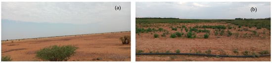 The area hosts a diverse range of plant and animal species [,]. However, biodiversity is progressively declining due to both anthropogenic and natural disturbances, with agricultural expansion being a primary driver []. Most of the study area is characterized by bare soils or scattered Acacia trees and shrubs, particularly in the western, central, and northern regions. The soils predominantly consist of Fluvisols, Leptosols, Lixisols, Vertisols, and Cambisols, which have been conventionally cultivated and grazed for centuries. Cultivation occurs during the rainy season, followed by heavy grazing after harvest, leaving the soils bare for the remainder of the year. Deforestation rates are high in the study area, with several studies reporting hotspots of declining annual and seasonal NDVI trends [], land productivity decline [], and serious desertification []. The NDVI map of the area (Figure 1f) indicates that vegetation cover is sparse across most of the study area. However, patches of Acacia trees and shrubs are commonly found in the southern regions, along with riverine forests lining the riverbanks.