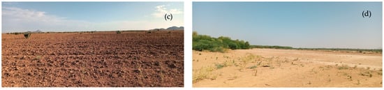 The climate of the study area is predominantly arid [] with mean monthly temperatures ranging from 23.7 to 29.4 °C and annual rainfall varying between 184 and 680 mm []. Temperature increases from South to North, while rainfall exhibits the opposite trend, decreasing from South to North (Figure 1d,e). The topography predominantly consists of flat lowland plains with deep soils. Elevation generally decreases from South to North and from East to West (Figure 1c). The crop growing season is very short where most of the time rain starts late and ends early; the rainy season expands from early July to early September.