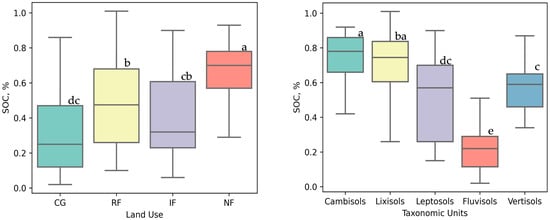 Land use/land cover is an important factor that affects soil, and is commonly incorporated in SOC studies [,,,,]. Accordingly, land use and land use history data were recorded during soil sampling for most locations. For samples with missing land use information, land use types were identified based on prior knowledge of the study area and verified using Google Earth Pro. Four primary land use types were identified: communal grazing (CG), rainfed farming (RF), irrigated farming (IF), and natural forest (NF), and were numerically coded as 1, 2, 3, and 4, respectively.
