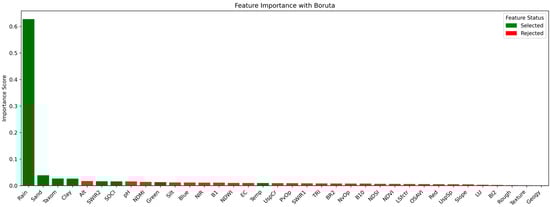 - The Boruta feature selection wrapper algorithm was employed to select from the 36 proposed input variables. The algorithm is among the commonly used feature selection techniques in SOC prediction studies [,].