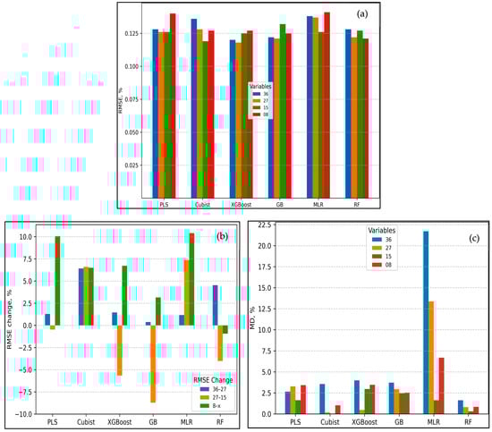 Figure 3 presents the conceptual flowchart of the methodologies employed. The models were trained, calibrated, and validated based on the extraction of independent SOC predictor variables to estimate target SOC values. The SOC modeling process was executed using Python 3.11.7 in the Jupyter Notebook environment. The dataset was randomly partitioned into training (80%) and testing (20%) subsets. We tested multiple algorithms, including MLR, PLS, Cubist, RF, GB, and XGBoost. Hyperparameter tuning and refinement were performed for each algorithm, with the exception of MLR, to optimize model performance, with particular emphasis on minimizing model discrepancies. Models were fitted, trained, calibrated, and validated, and their performance was assessed using commonly established metrics: RMSE, R2, RPD [,,,], and model discrepancy (MD), as defined by Equations (11), (12), (13), and (14), respectively.
