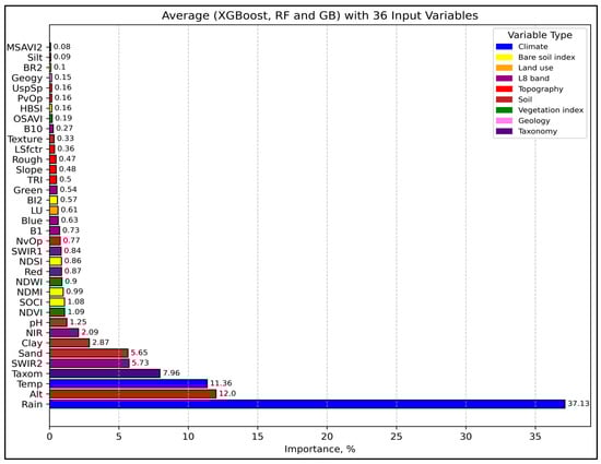 Variables selection is critical in SOC modeling, where soil-forming factors such as climate, soil properties, topography, parent material, vegetation, and human activities are commonly used as predictors. Several studies have reported that climate exerts the strongest control on SOC variability [,,,,,]. However, other studies have identified different primary drivers of SOC, including vegetation [], climate and altitude [], altitude and clay content [], and use/land cover, soil properties, and bioclimatic variables [], rainfall and vegetation [,], as well as geological units, soil taxonomic units, climatic, and topographic factors []. Moreover, Ref. [] noted that the red and near-infrared (NIR) spectral bands were the most important predictors of SOM. These results suggest that including all potential SOC predictor variables enables the identification of key drivers through feature importance ranking. Decision tree-based machine learning algorithms, such as RF, GB, and XGBoost, are particularly robust for this purpose.